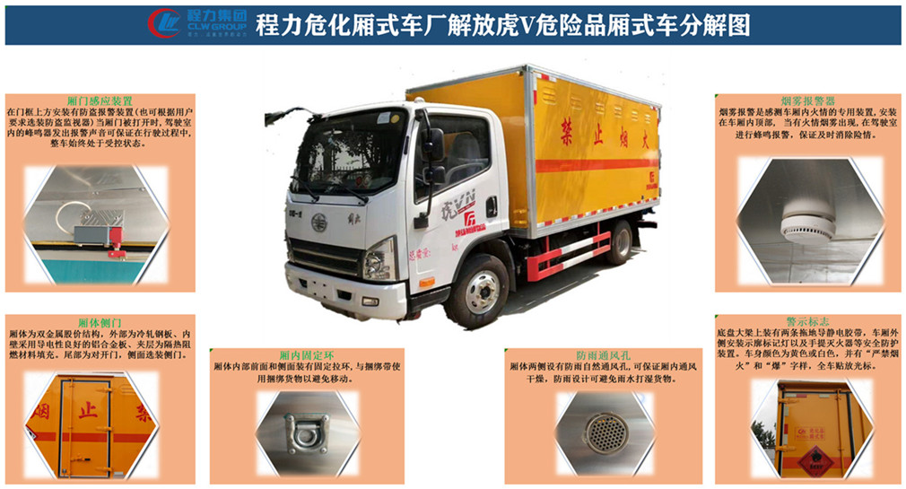 車廂頂部封閉,不可開啟;安裝限速裝置,限速80km/h,安全裝置為導靜電帶,用于防止靜電,該車安裝帶有衛星定位功能的行駛記錄儀,僅采用前盤制動器和安裝ABS的底盤,排氣管前置,僅采用子午線輪胎;該車為危險貨物運輸車.用于運輸具有獨立容器(瓶)包裝的:黑火藥,壓縮黑火藥,電引爆雷管,爆破炸藥,點燃導火索;類項號:1.1D,1.1D,1.1B,1.1D,1.4G;車輛類型為EX/Ⅱ型;側防護和后防護裝置材料材質為Q235碳鋼,側防護與箱體底部焊接連接,后防護裝置與車架采用焊接連接,后防護截面尺寸(mm):100×50,離地高度為500mm;,選裝側門型式及位置,選裝不開側門,廂體側面板選裝開百葉窗,選裝瓦楞板結構,選裝液壓升降尾板,選裝液壓升降尾板時收起狀態的水平長度為300mm;選裝不開側門時寬度2200mm;發動機型號與油耗值一一對應:4B2-95C50/10.83(L/100km),WP2.1Q95E50/12.39(L/100km),4B2-110C50/12.97(L/100km),WP2.3Q110E50/12.01(L/100km),CA4DC3-12E5-30/12.55(L/100km),ABS生產廠家/型號:上海萬捷汽車控制系統有限公司/VIE