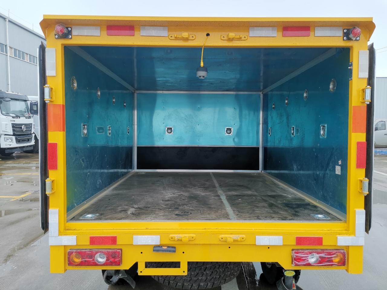 上裝配置:貨廂尺寸為2030X1780X1210(mm)、廂體外飾冷板、內飾鋁板、中間為防阻燃泡沫、廂內安裝臥環、煙霧報警器、防盜報警器、后雙開門(選裝隔斷及側開門)、帶拖地靜電帶,兩個滅火器,危險品警示燈,危險品標牌,其它均按廠標組織生產。