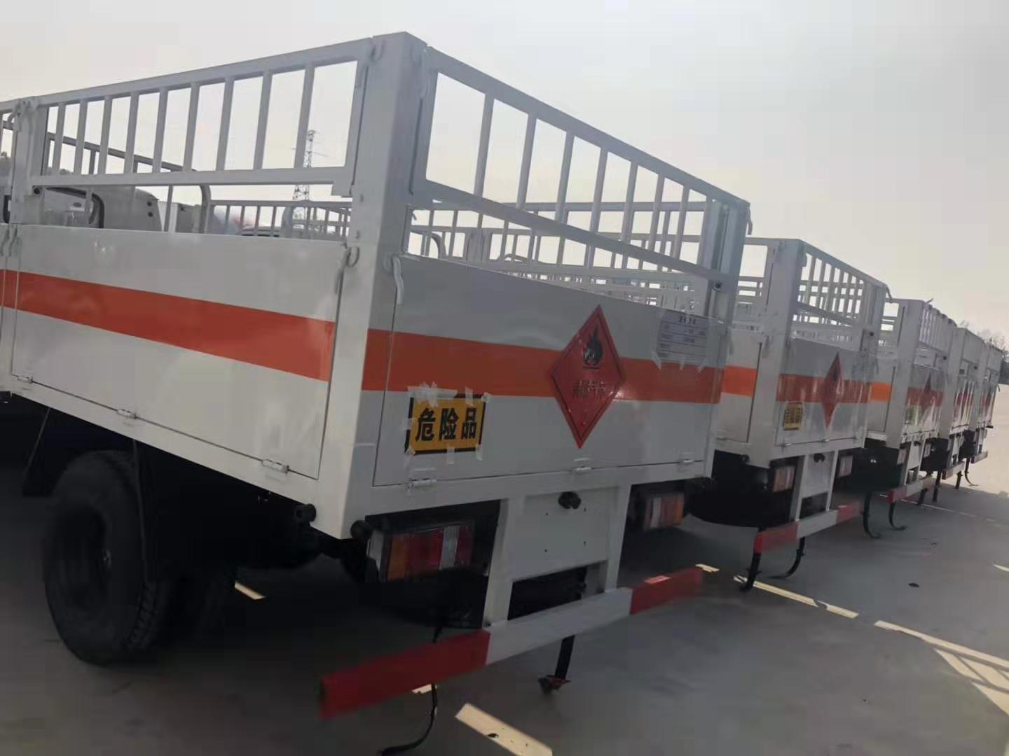 山東徐總因業務需求在我司批量訂購了五臺江鈴4.1米氣瓶運輸車,該車采用江鈴原廠危險品車底盤,3360mm軸距、JX493ZLQ4江西五十鈴發動機(108馬力)、7.0鋼絲輪胎、助力、油剎、148車架、1.5噸前橋/3.3噸級后橋、12伏單電瓶、前置排氣管、貨廂尺寸為4200X1850X1730(mm),邊板對折四開門、外板采用1.2MM厚冷軋板,內襯為矩形管骨架牢靠穩定,底板為3mm厚花紋板,有靜電帶、滅火器、防火罩。整車國標反光標示及警告標志;目前車輛已做好,以下是具體實拍圖片: