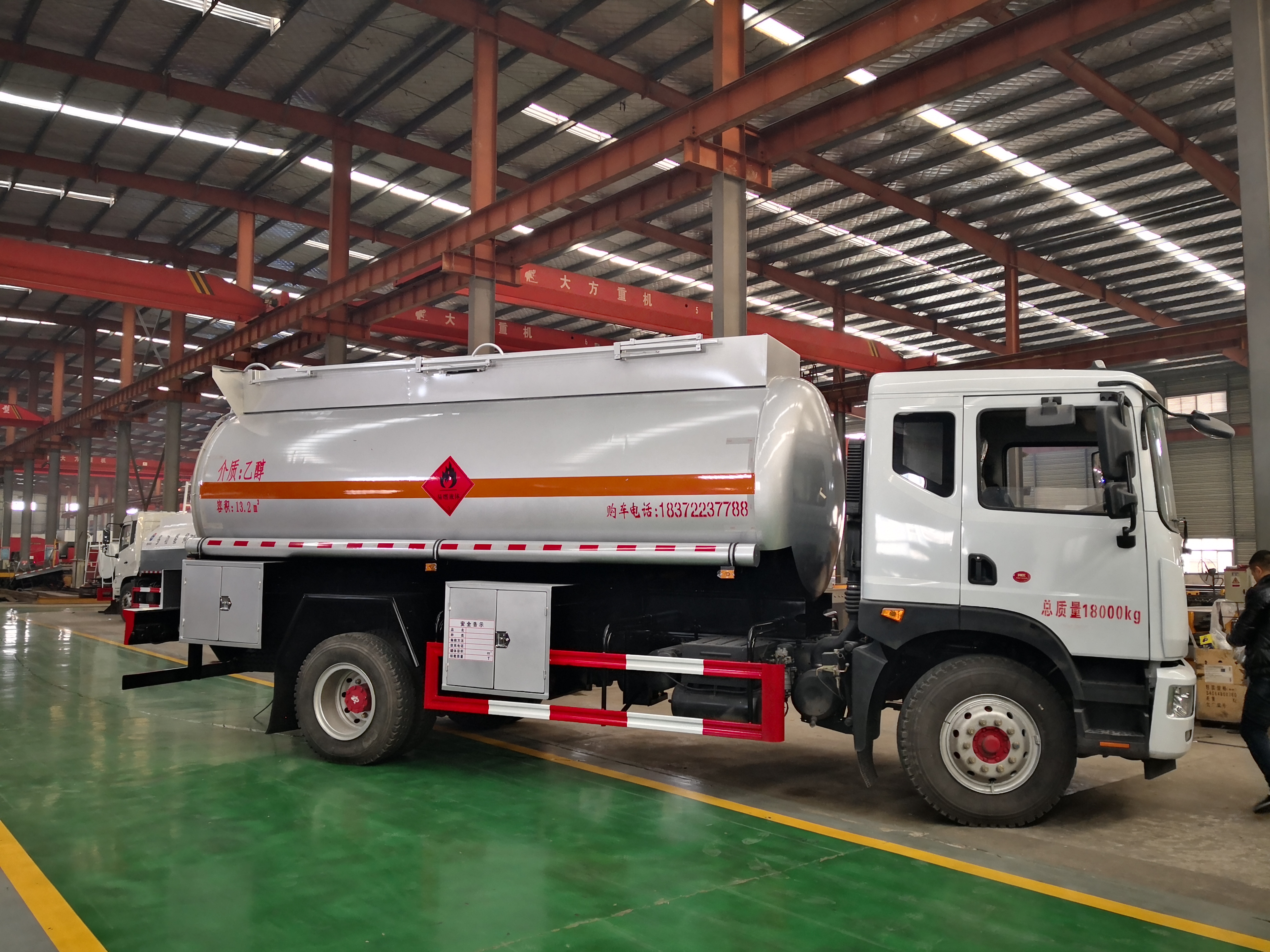 采用東風D9原廠危貨底盤,型號EQ1181LJ9BDEWXP ,ISB180 50發(fā)動機,國五排放標準,法士特小八檔變速箱,軸距4700mm,10.00R20鋼絲胎,排氣管前置,前盤限速、ABS,帶空調(diào),中控鎖,電動玻璃,符合國家標準及該車型公告要求。嚴格按公告尺寸及外型制作,公告容積13.2立方,介質(zhì):乙醇,罐體采用優(yōu)質(zhì)碳鋼Q235材質(zhì)5mm厚制作,前后封頭采用5.5mm,專用鋼齒泵,可泵進泵出(進出口設(shè)計在車輛副駕駛側(cè)尾部),一個歐標罐口,一個氣動海底閥帶緊急切斷,海底閥5公里報警裝置,一個工具箱,靜電裝置,防火帽,后爬梯,貼反光條,反光帶,安全告示,三個 “易燃液體”標識,配兩根與管道箱同長的輸液管及陰陽端接頭,滅火器,其余按公司正常標準制作。