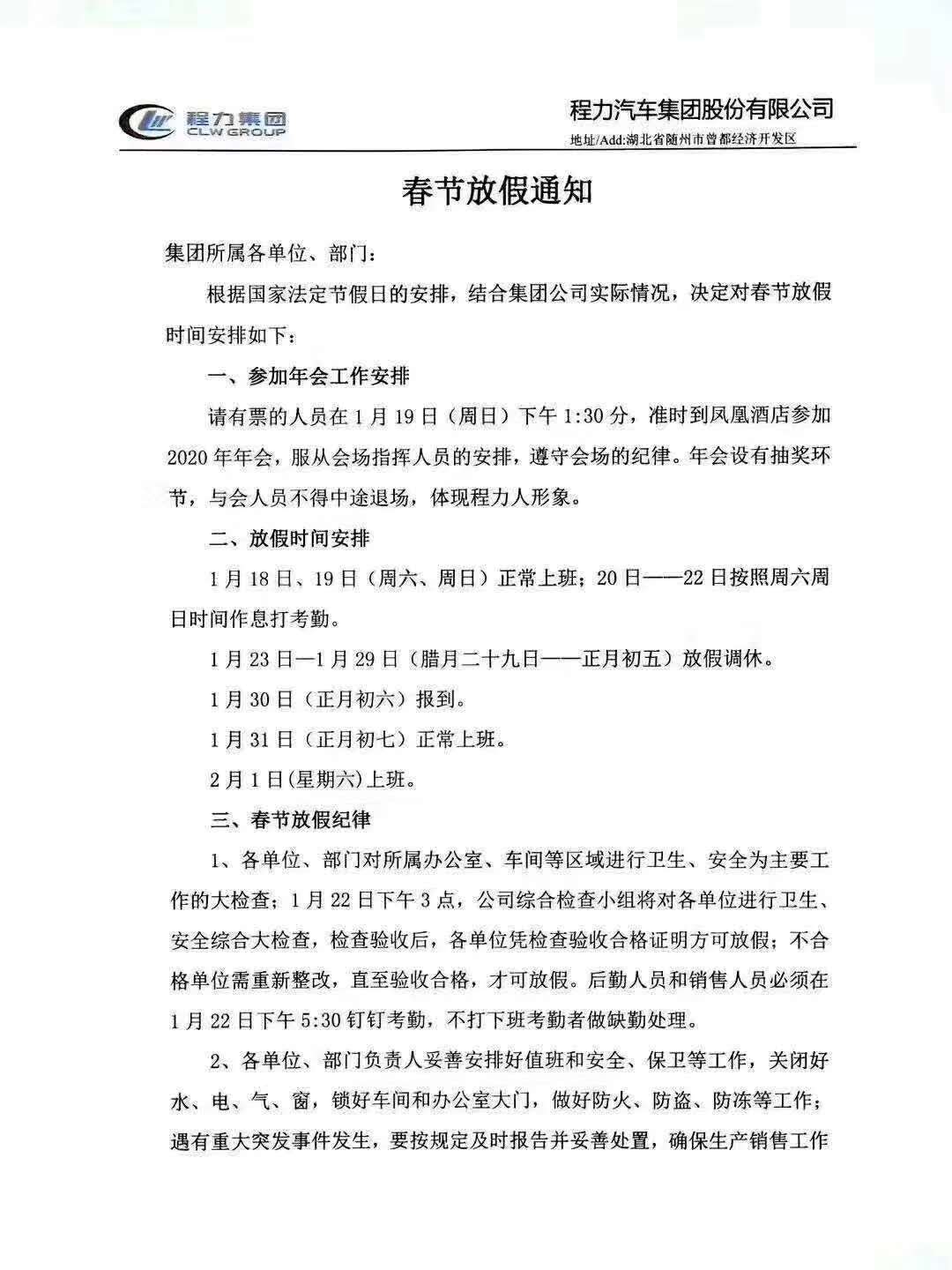 以上是公司放假通知,請(qǐng)知悉!需要購(gòu)車的客戶,可提前與我司聯(lián)系,公司會(huì)為您妥善安排!感謝新老客戶的支持與信任,程力專汽提前祝大家新年快樂!