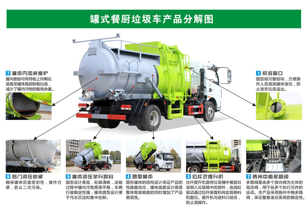 餐廚垃圾車,又稱餐余垃圾車余廚垃圾車或者泔水車,餐廚垃圾車是垃圾車中的一種,是用于收集和運輸生活垃圾、食品垃圾(泔水)及城市淤泥的專用車輛。餐廚垃圾車不僅優化了居民居住的環境衛生,減少了空氣中的餐廚垃圾臭味,減少孳生蟑螂、細菌的可能, 改善了環衛作業環境,減少垃圾的四處分散造成的污染。