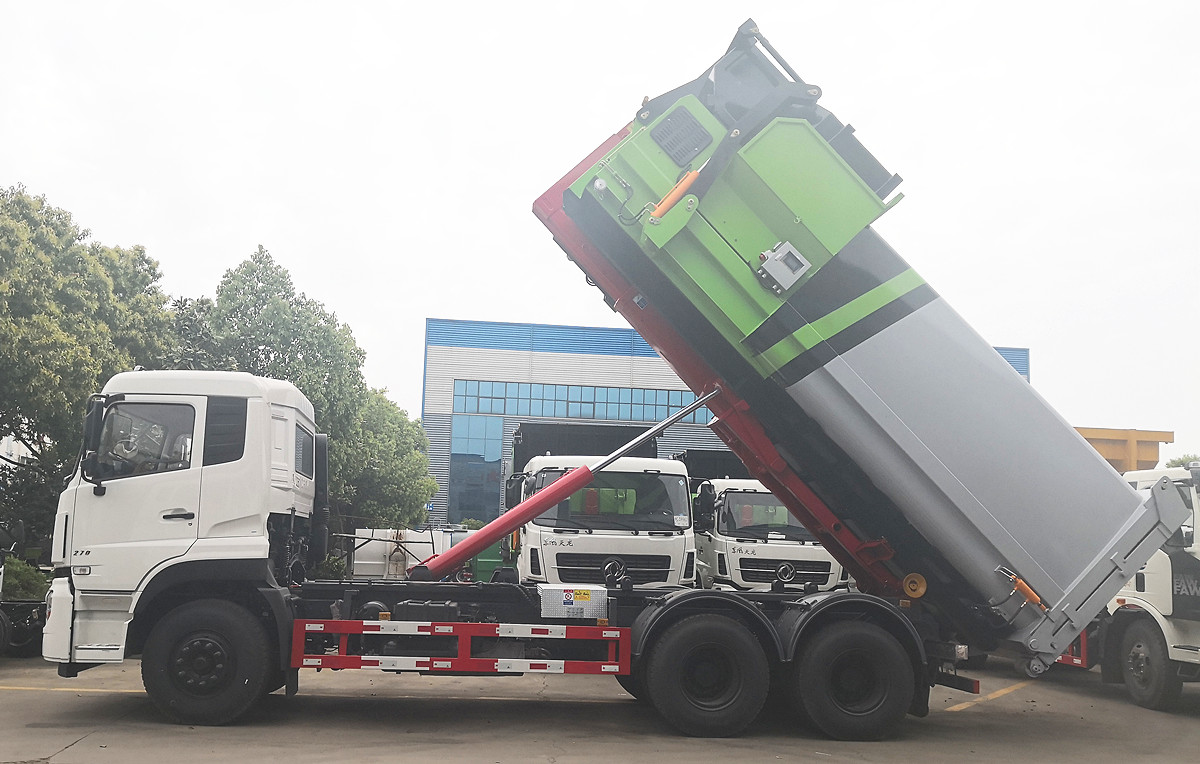 東風天龍勾臂垃圾車帶移動式壓縮垃圾站