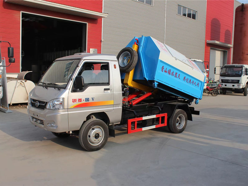 勾臂式垃圾車可將地下垃圾箱內的垃圾及垃圾箱一同拉至車上運走同時可自卸,且垃圾箱體采用液壓鎖緊或開啟,降 低了工人的勞動強度和改善了工作環境。該垃圾車的收運方式是目前世界上廣泛采用的垃圾收運方式,可以實現一車多箱,大大降低了配備成本和空間等等;其專用裝置的功能均以汽車發動機為動力,通過液壓機構手動或電控、氣控來實現。