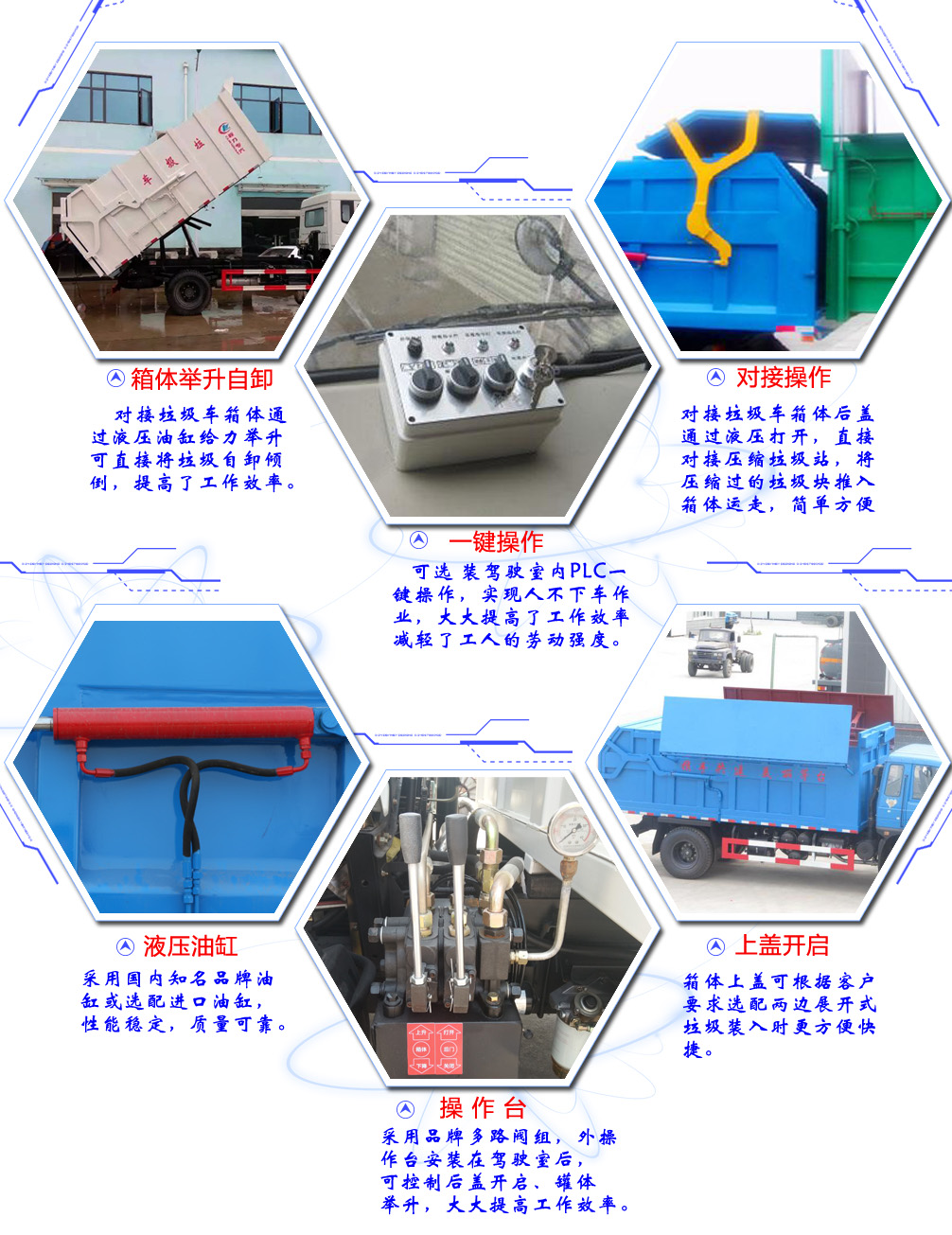 對接式垃圾車又稱垃圾壓縮站對接式垃圾車:是用于城鎮(zhèn)垃圾壓縮站內(nèi)的垃圾轉(zhuǎn)運(yùn)、卸料作業(yè)的專用車,該垃圾車的收運(yùn)方式是目前國內(nèi)廣泛采用的垃圾壓縮站垃圾轉(zhuǎn)運(yùn)方式,可以實(shí)現(xiàn)一車多站,大大降低了配備成本和空間等等。其專用裝置的功能均以汽車發(fā)動機(jī)為動力,通過液壓機(jī)構(gòu)手動或電控,氣控來實(shí)現(xiàn)。車輛的箱體采用優(yōu)質(zhì)碳鋼板全密封焊接結(jié)構(gòu),具有強(qiáng)度高,重量輕,不產(chǎn)生二次污染等優(yōu)點(diǎn)。