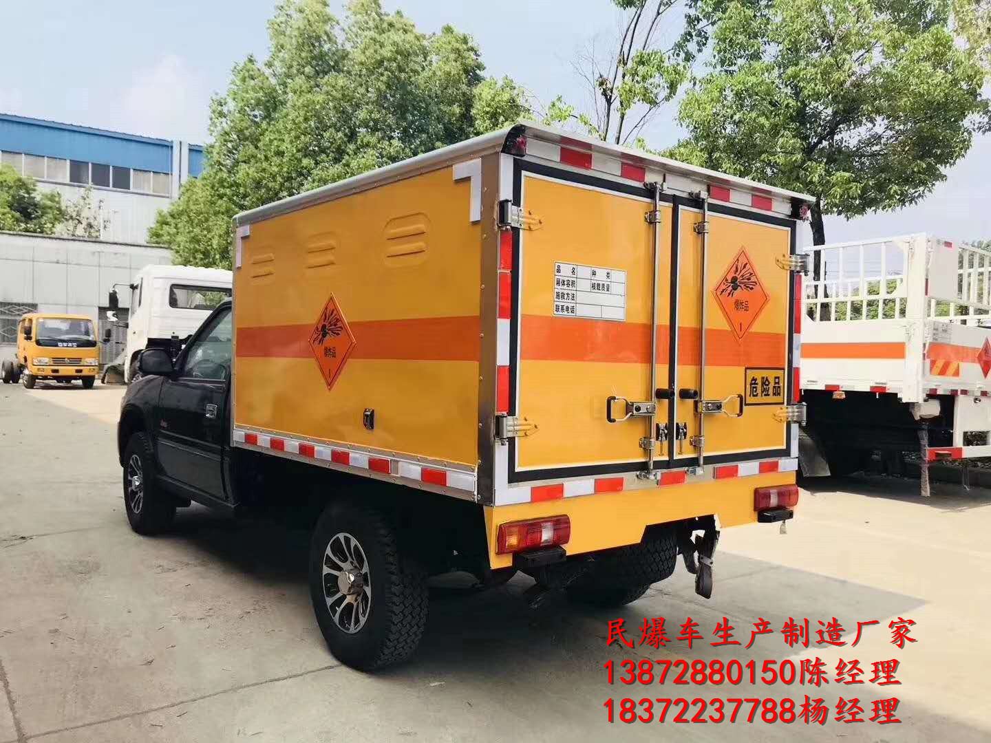 慶鈴五十鈴皮卡爆破器材運輸車,采用慶鈴五十鈴皮卡單排駕駛室底盤,整車帶有中控門鎖、電動門窗、多功能方向盤、額載500㎏,四驅,五十鈴130馬力發動機,動力足,駕駛舒適,廂體廠2.1米,廂體外飾冷板、內飾鋁板、中間為防阻燃泡沫、廂內安裝臥環、煙霧報警器、防盜報警器、右邊開側門、后雙開門、帶拖地靜電帶,其它均按廠標組織生產。