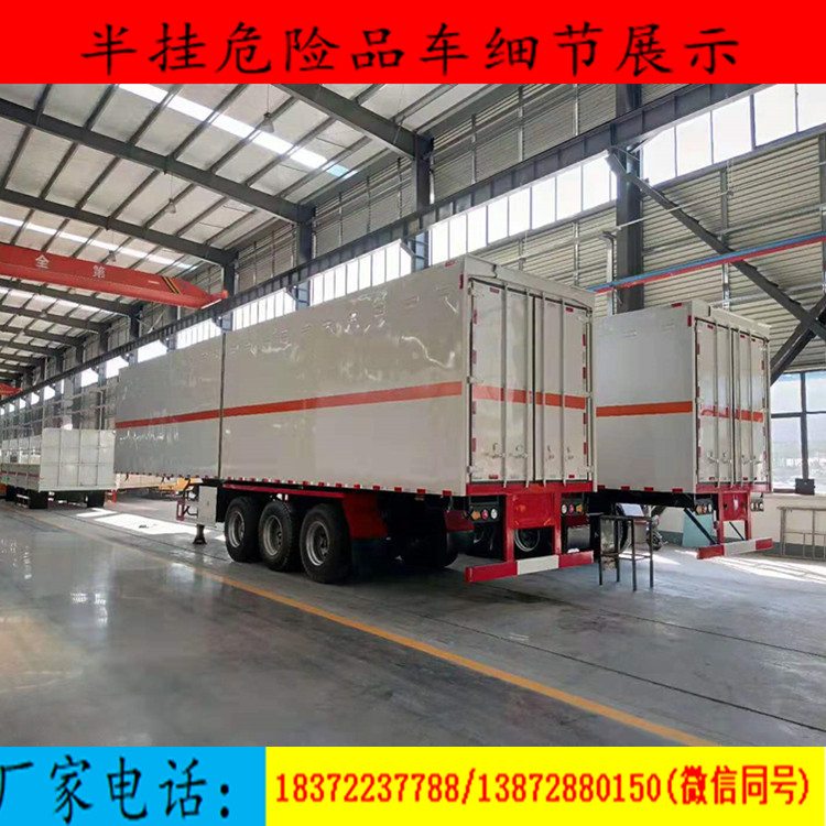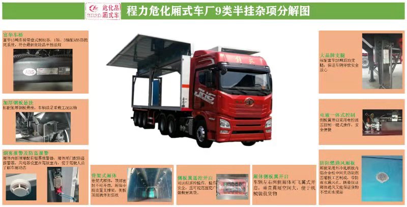 危險品車作為專用特種專用車,運輸裝卸相比普通貨物更麻煩,為了讓客戶卸貨更方便,今天為您推薦的是九類雜項半掛翼展危險品車,具體明細如下:
