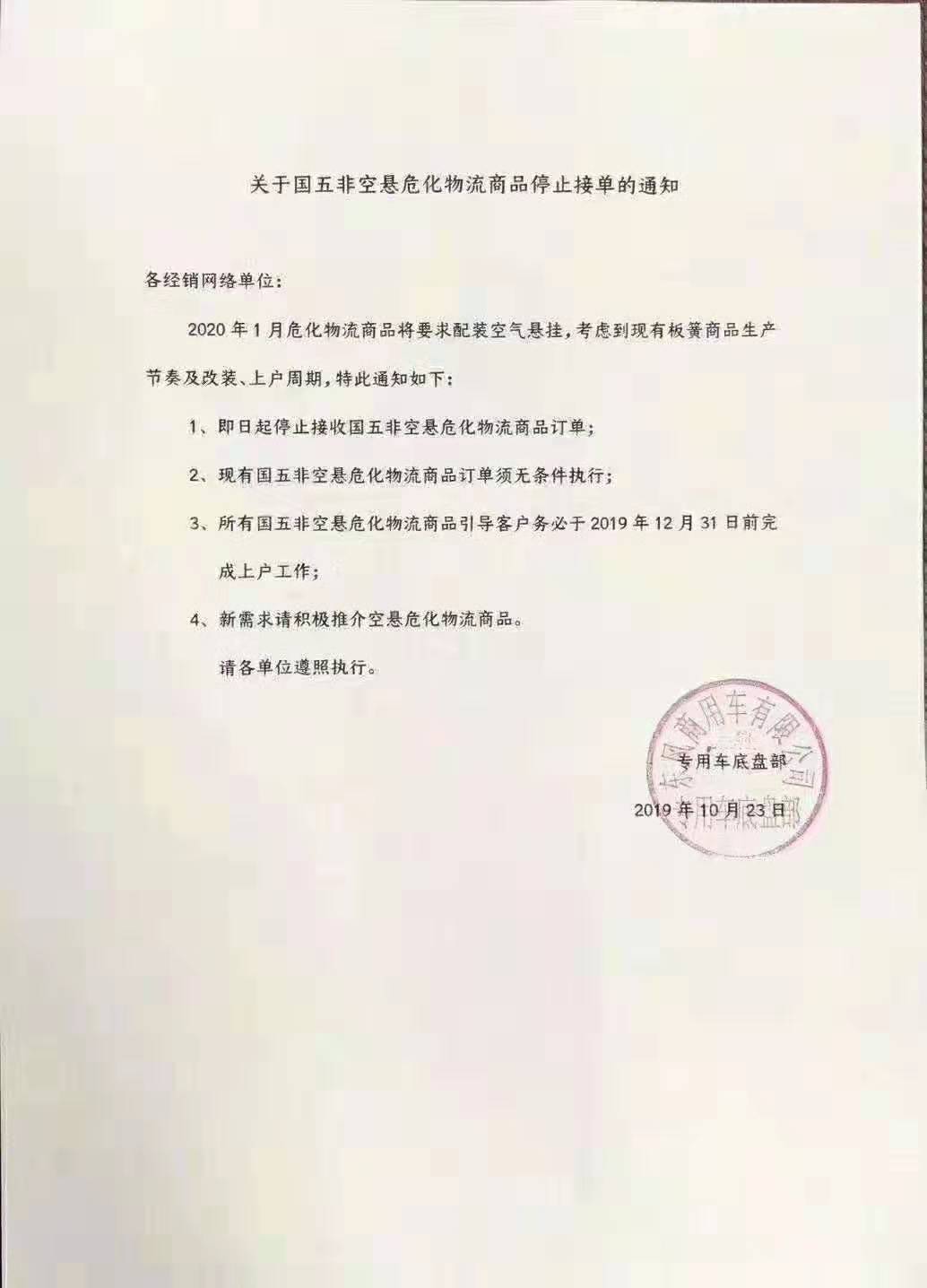從2020年1月1日起,總質(zhì)量在12噸以上危險品車必須安裝空氣懸掛,東風(fēng)商用已停止接收危險品板簧底盤訂單,目前市場暫存少量此類底盤,加裝空氣懸掛單臺車輛成本至少增加三萬,政策實施后客戶購車成本會增加!需要購此類車型的客戶可提前進行預(yù)訂!再次提醒只為加深您的印象!在今年5月1日危險品車實行安全達標時我們一一通知客戶,但仍有部分客戶未引起重視,后來政策實施后購車成本增加,客戶覺得后悔!希望各客戶酌情考慮!