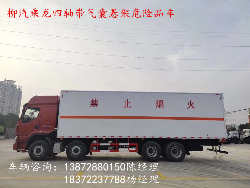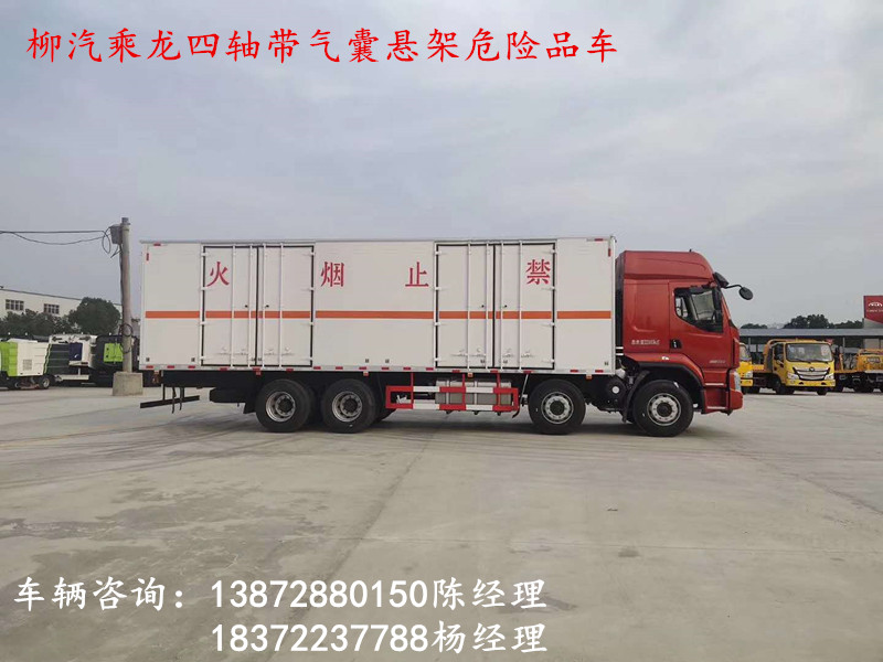 柳汽乘龍四軸危險品車整車尺寸:11950*2550*3950mm,貨箱尺寸:9400*2420*2500,上裝采用1mm厚冷軋板一次成型的百葉窗,內飾為導電性能良好的鋁板含透氣孔,內襯為矩形管骨架牢靠穩(wěn)定,內部填充為透氣防潮阻燃的擠塑,底板和車廂雙開,右側選擇側開門,內部有固定貨物的臥環(huán),外部有靜電帶,帶滅火器、防火罩,廂內安裝煙霧報警器和門防盜報警器。