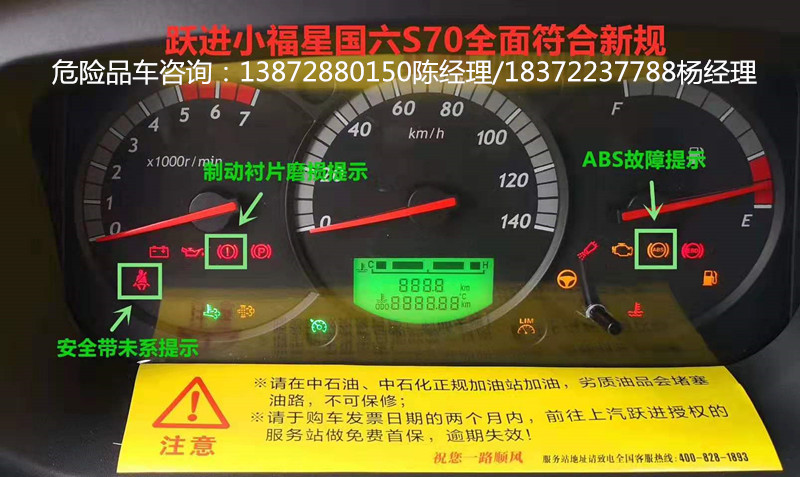 為了讓客戶及時訂車,現新推出國六躍進小福星危險品車!該車全部符合新規,全系標配安全帶未系提示,全系標配制動襯片磨損提示!目前新規底盤大量現貨,歡迎各新老客戶來電咨詢!
