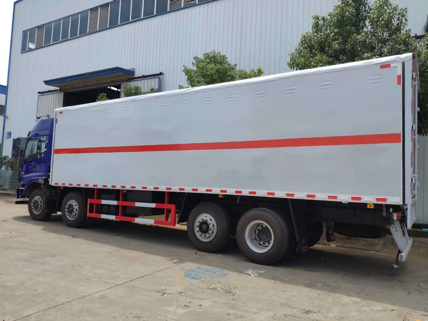 為了滿足大型危貨車裝卸貨物需求,現特推出廂體帶翼展式新型危貨車,代表車型是——福田歐曼前四后六9.6米翼展危貨車。以下是福田歐曼前四后六9.6米廂長危險品運輸車,翼開啟廂式車廂體矩型方管框架結構,鋁型材邊框、外飾鋁波紋板,內飾鍍鋅平板,外頂整張鍍鋅平板,(可選鐵瓦楞材質)帶防水槽,3mm厚花紋底板并帶臥環。左右兩側雙飛翼液壓開起式車廂,廂體下端可以選裝活動欄板。
