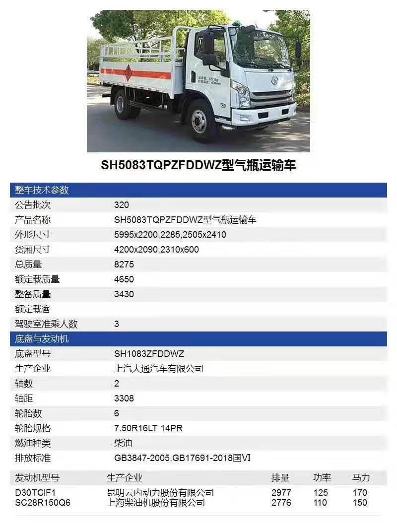 D30TCIF1云內(nèi)170馬力柴油機,上汽6檔變速器,3308軸距,7.50R16鋼絲胎,原廠危險品底盤,2米寬體高頂駕駛室,貨箱尺寸:4200*2310*600,總質(zhì)量8275kg,額定載質(zhì)量4650kg,整備質(zhì)量3430kg,方向助力,空調(diào),中控鎖,電動玻璃,遙控鑰匙,多功能方向盤,氣剎,斷氣剎,新款轎車內(nèi)飾。