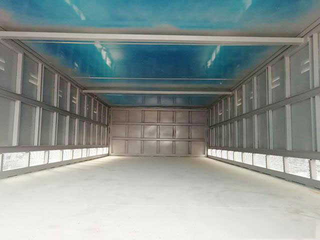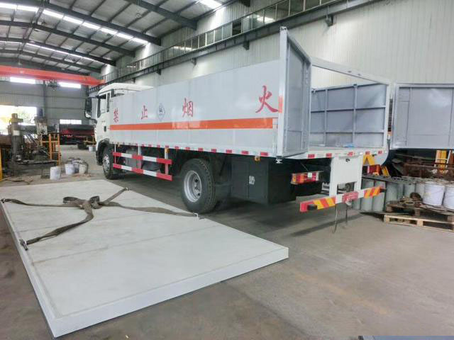 2)上裝配置:廂長6.6米,廂體采用外冷軋板內框架,采用槽鋼連接方管焊牢加固,廂體側板上面帶一次性沖壓成型百葉窗,側板下面帶網眼透氣孔,底板5mm厚鋼板,底部上鋪防靜電膠皮,后門安裝防盜報警器,帶危險品三角燈防火罩。