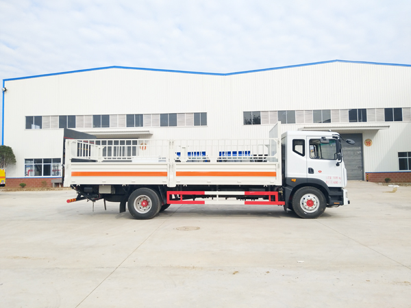 東風D9額載10噸氣瓶運輸車采用原廠危貨底盤,5200mm軸距,6檔變速箱,帶ABS,前盤制動,限速器,排氣管前置,9.00R20輪胎,發動機:ISD160 50,防飛濺,自動調整臂,帶原廠空調,貨箱配置:整車尺寸:9000X2550X3020,貨箱長寬高:6750X2350X600(單位毫米),廂體為金屬骨架結構,廂體生產工藝采用4mm底板,鋪靜電膠皮,高600mm的墻板,上側配可拆卸護欄。配備隨車工具。可原裝液壓尾板,車輛嚴格按照公告制作。