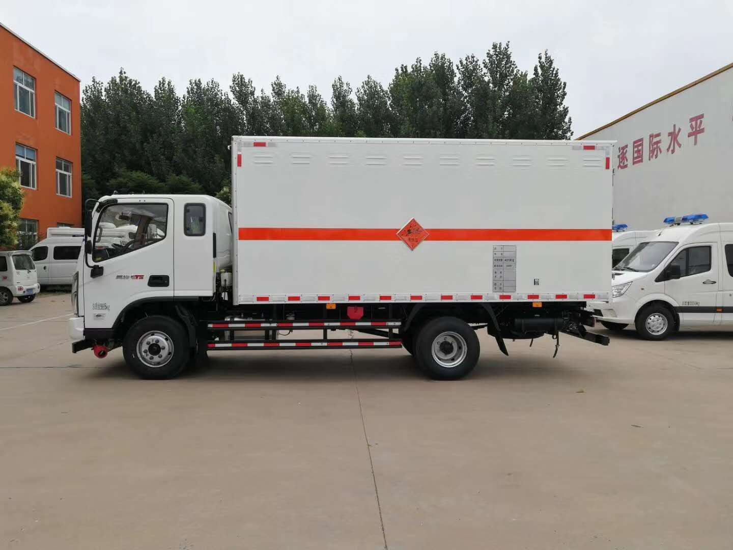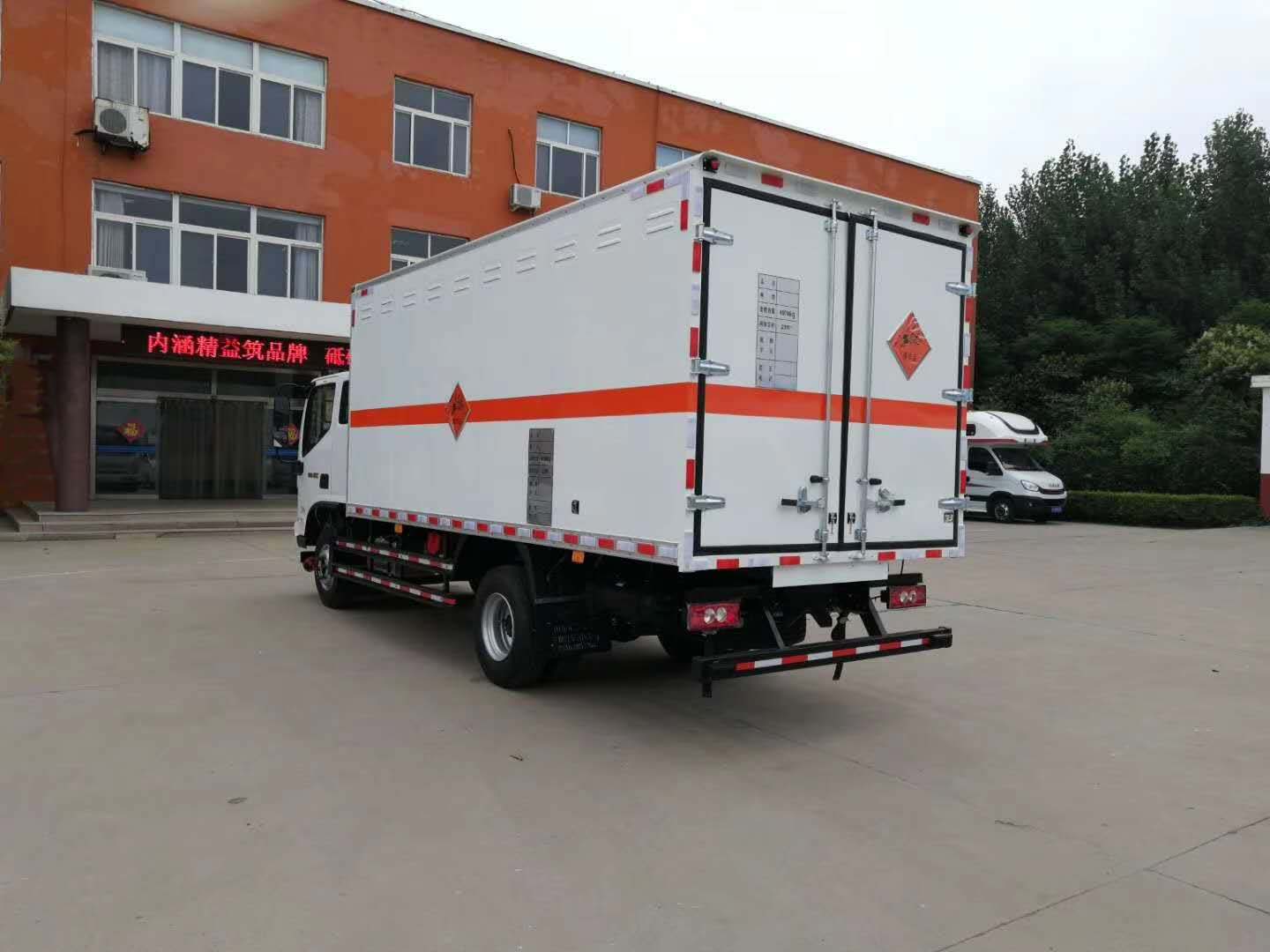 福田奧鈴國六危險品車廂體安裝防飛濺;前后示廓燈;駕駛室頂安裝危險品警示燈;底盤尾部安裝導靜電拖帶;兩側邊板及后板橙色反光帶、危險品標志牌,尾部粘貼危險品標志牌和警告標識牌;車廂前板外部安裝滅火器2只;側防護、后防護符合國家要求;車身貼紅白反光貼,側標志燈符合國家要求