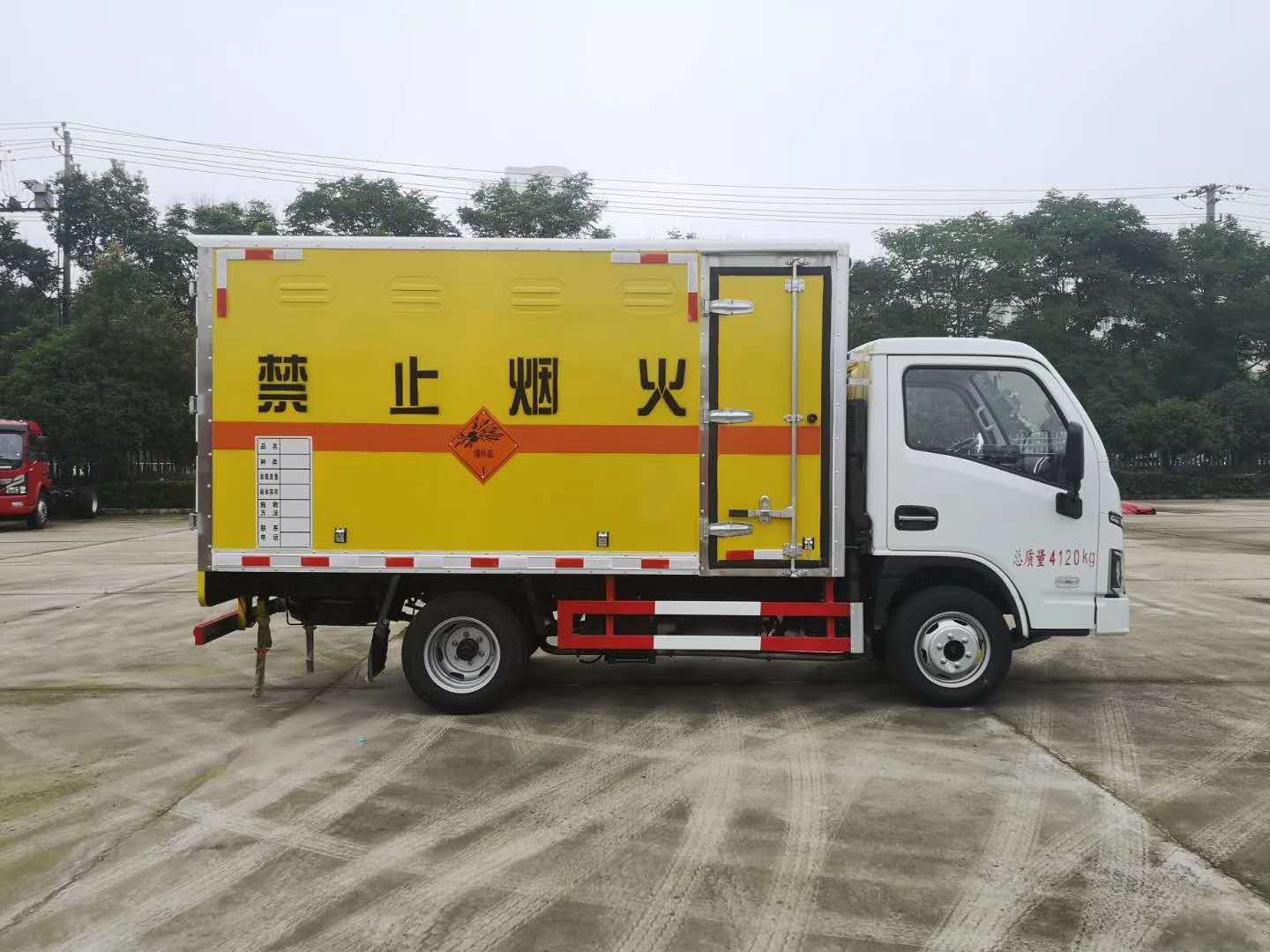 2)上裝配置:外飾冷軋鋼板,內飾鋁合金板,中間填充隔熱阻燃材料,(選裝側門和隔倉)廂體兩側上方設有防雨功能自然通風窗口,底部鋪有阻燃導靜電膠板,廂體側面裝有固定拉環,與捆綁帶使用捆綁貨物以避免移動。在車廂內頂部安裝感煙報警器,在門器框上方安裝有防盜報警器,廂體外側安裝示廓燈及滅火器支架,配置兩個滅火器,并有“嚴禁煙火”和“爆”等字樣,廂體周邊貼反光標識。后門貼有安全告示,危險品標牌。車輛尾部安裝兩條拖地導靜電膠帶,駕駛室頂部裝有安全三角燈。廂體顏色有:黃、白、灰色等可選。