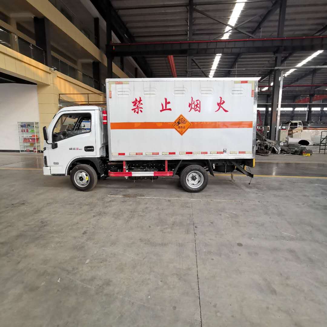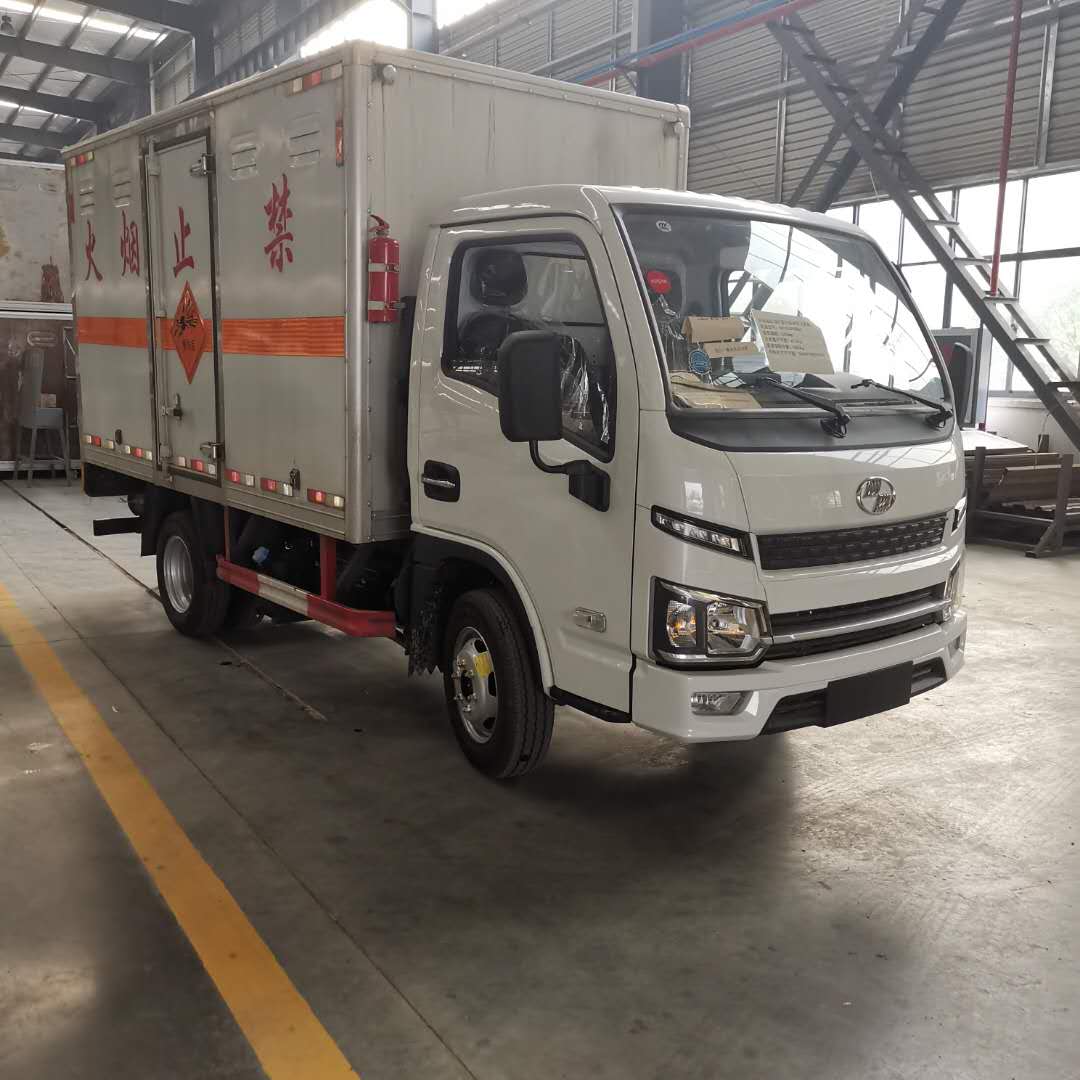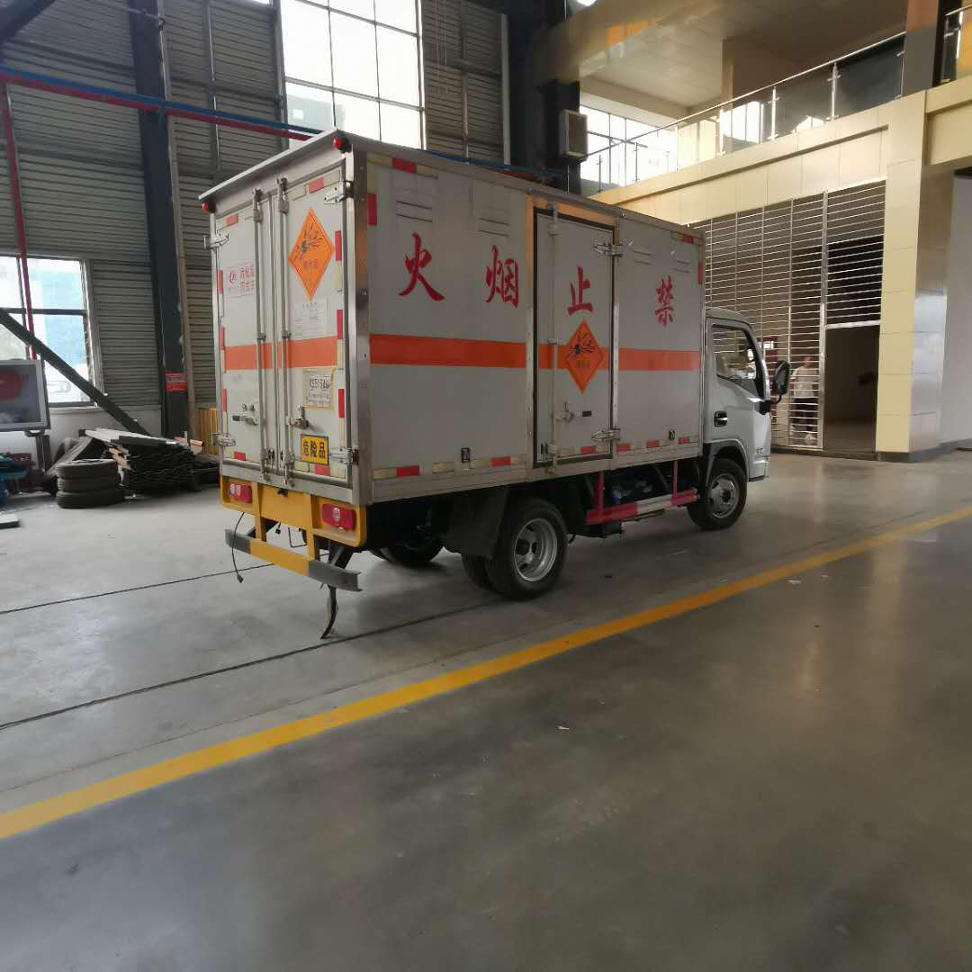 2)上裝配置:外飾冷軋鋼板,內飾鋁合金板,中間填充隔熱阻燃材料,(選裝側門和隔倉)廂體兩側上方設有防雨功能自然通風窗口,底部鋪有阻燃導靜電膠板,廂體側面裝有固定拉環,與捆綁帶使用捆綁貨物以避免移動。在車廂內頂部安裝感煙報警器,在門器框上方安裝有防盜報警器,廂體外側安裝示廓燈及滅火器支架,配置兩個滅火器,并有“嚴禁煙火”和“爆”等字樣,廂體周邊貼反光標識。后門貼有安全告示,危險品標牌。車輛尾部安裝兩條拖地導靜電膠帶,駕駛室頂部裝有安全三角燈。廂體顏色有:黃、白、灰色等可選。