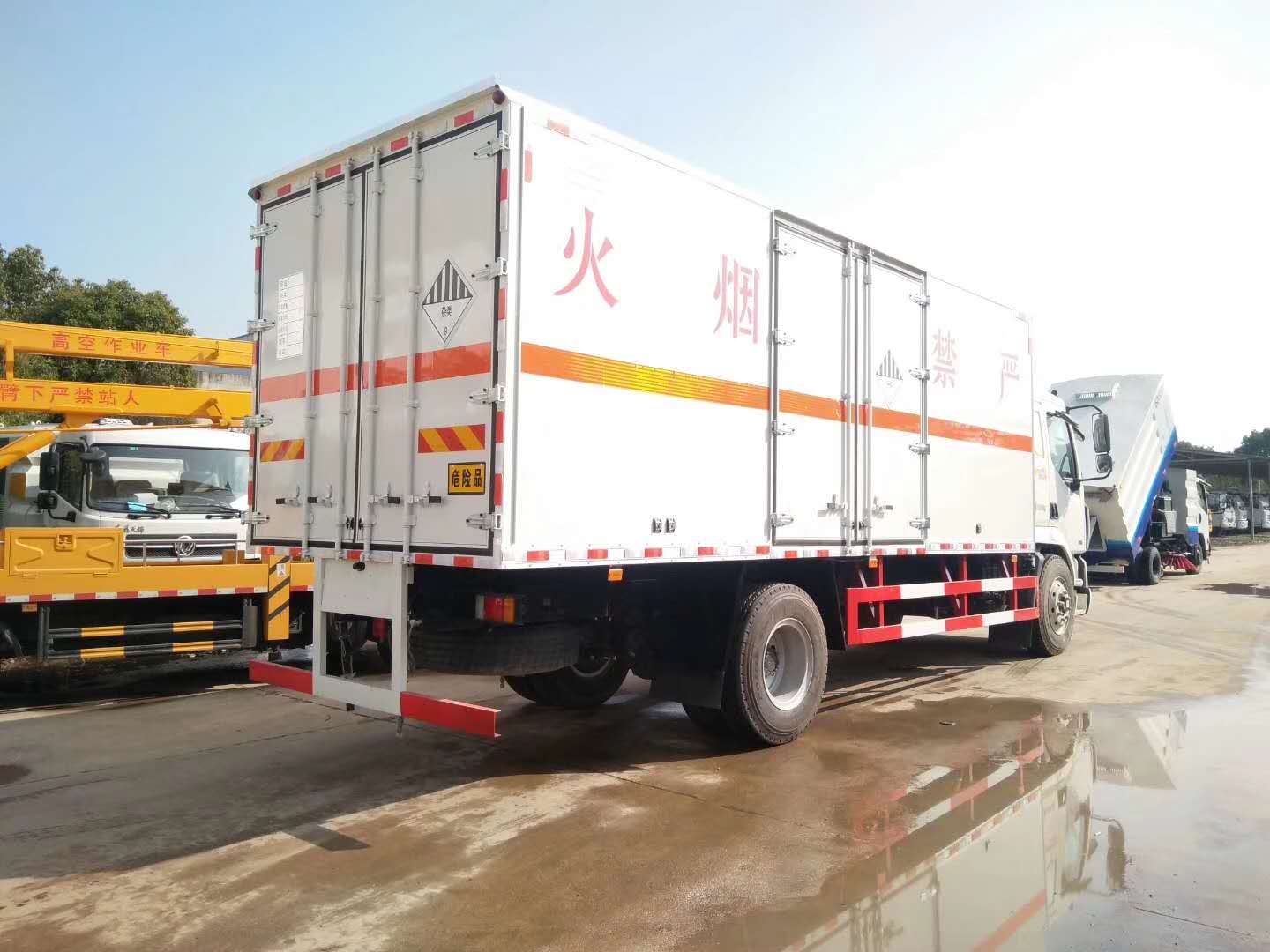 柳汽乘龍單橋新規(guī)危險(xiǎn)品車嚴(yán)格按照公告尺寸制作,外板采用1mm厚冷軋板有一次性成型的百葉窗,內(nèi)飾為導(dǎo)電性能良好的鋁板有透氣孔,內(nèi)襯為矩形管骨架牢靠穩(wěn)定,內(nèi)部填充為透氣防潮阻燃的擠塑板,四種材料經(jīng)現(xiàn)代工藝復(fù)合而成,廂體外部上下鋁合金型材包邊,底板和車廂前下部鋪橡膠皮,后門雙開,右側(cè)中部雙開門,內(nèi)部有固定貨物的臥環(huán),車輛外部有靜電帶、滅火器、防火罩,車廂內(nèi)安裝煙霧報(bào)警器和門防盜報(bào)警器,嚴(yán)格按照國家危險(xiǎn)品相關(guān)法規(guī)張貼。