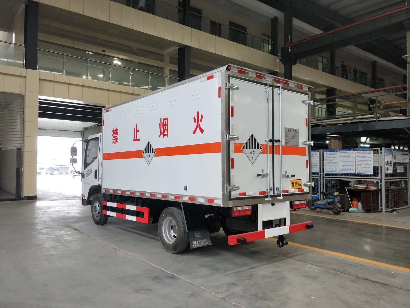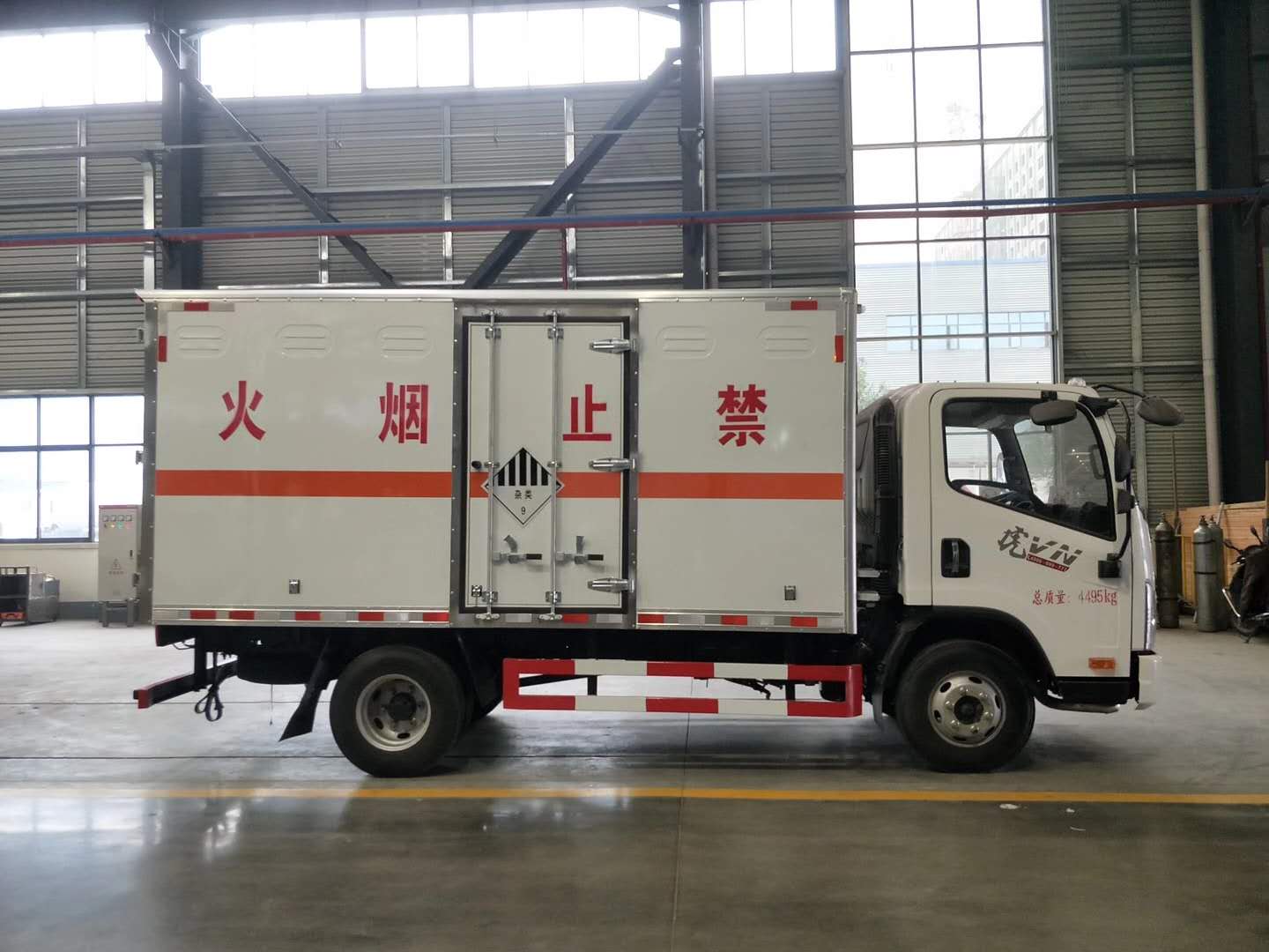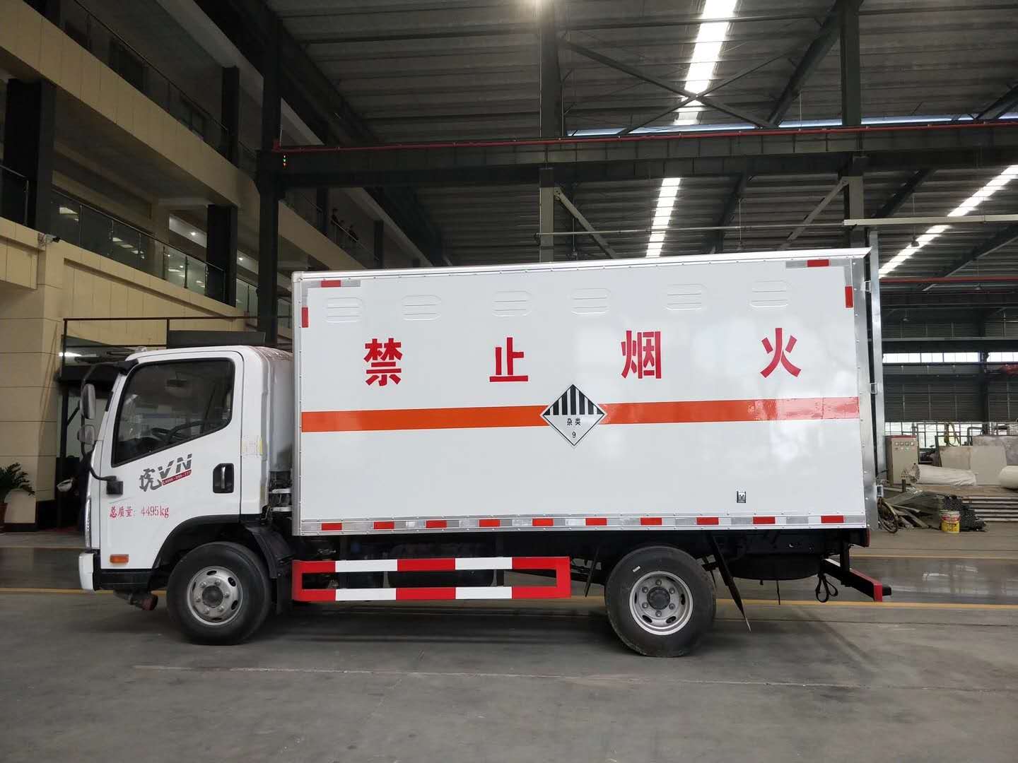 解放虎V危險品車采用解放危險品車底盤,外形尺寸:5995*2130*2800mm,廂體內尺寸:4050*2000*1800mm,濰柴110馬力國五柴油發動機,3300mm軸距,7.00R16輪胎,帶方向助力、帶空調、帶前盤制動,排氣管前置,帶限速器及大燈可調節裝置,廂體采用雙層金屬骨架,外冷軋板、內鋁板,中間夾有國標防阻燃材料,廂體底部鋪防靜電膠片,廂體內配煙霧報警器,車輛內配防盜報警器,帶防火帽、滅火器,粘貼危險品標識、反光貼,隨車帶合格證、上戶發票、隨車工具。