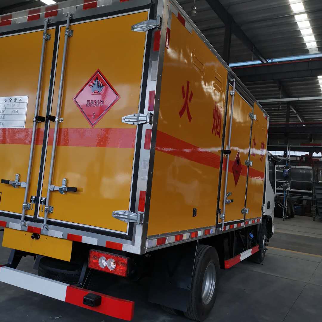 福田奧鈴黃牌4米2易燃液體廂式運輸車嚴格按照公告尺寸制作,外板采用1mm厚冷軋板有一次性成型的百葉窗,內飾為導電性能良好的鋁板有透氣孔,內襯為矩形管骨架牢靠穩定,內部填充為透氣防潮阻燃的擠塑板,四種材料經現代工藝復合而成,廂體外部上下鋁合金型材包邊,底板和車廂前下部鋪橡膠皮,后門雙開,右側中部單開門,內部有固定貨物的臥環,車輛外部有靜電帶、滅火器、防火罩,車廂內安裝煙霧報警器和門防盜報警器,嚴格按照國家危險品相關法規張貼。