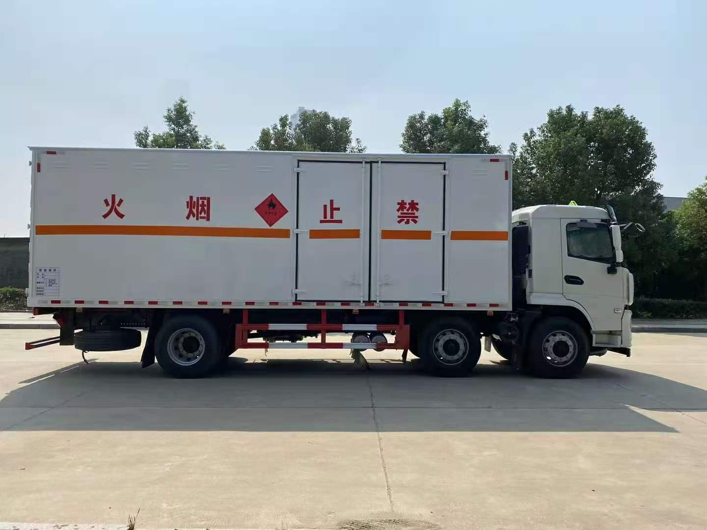 陜汽三軸國六雜項危險品車廂體采用外板采用1mm厚冷軋板有一次性成型的百葉窗,內飾為導電性能良好的鋁板有透氣孔,內襯為矩形管骨架牢靠穩定,內部填充為透氣防潮阻燃的擠塑板,廂體外部上下鋁合金型材包邊,底板和車廂前下部鋪橡膠皮,后門雙開,內部有固定貨物的臥環,車輛外部有靜電帶、滅火器、防火罩,車廂內安裝煙霧報警器和防盜報警器,嚴格按照國家危險品相關法規張貼“易燃液體”反光標。