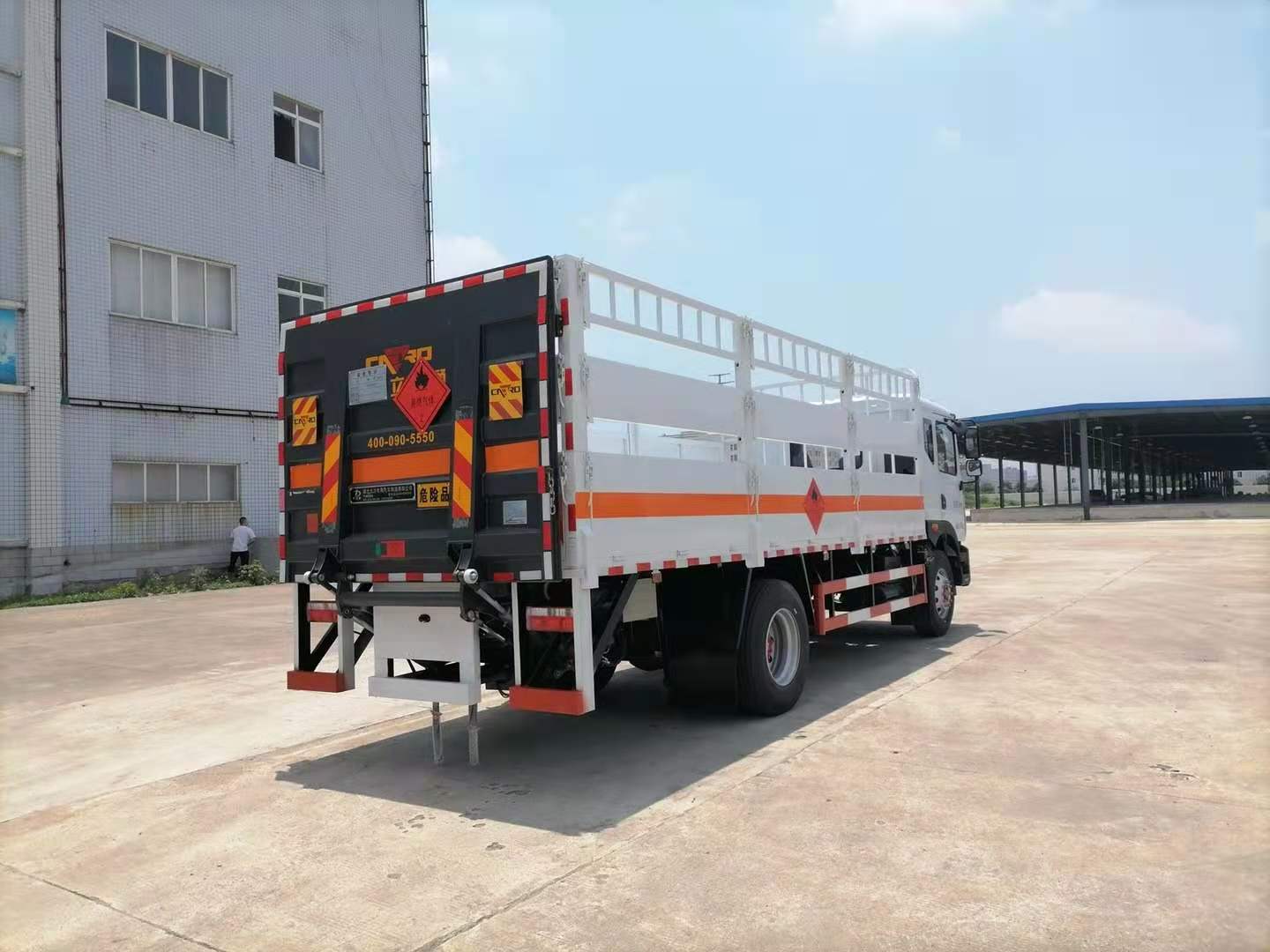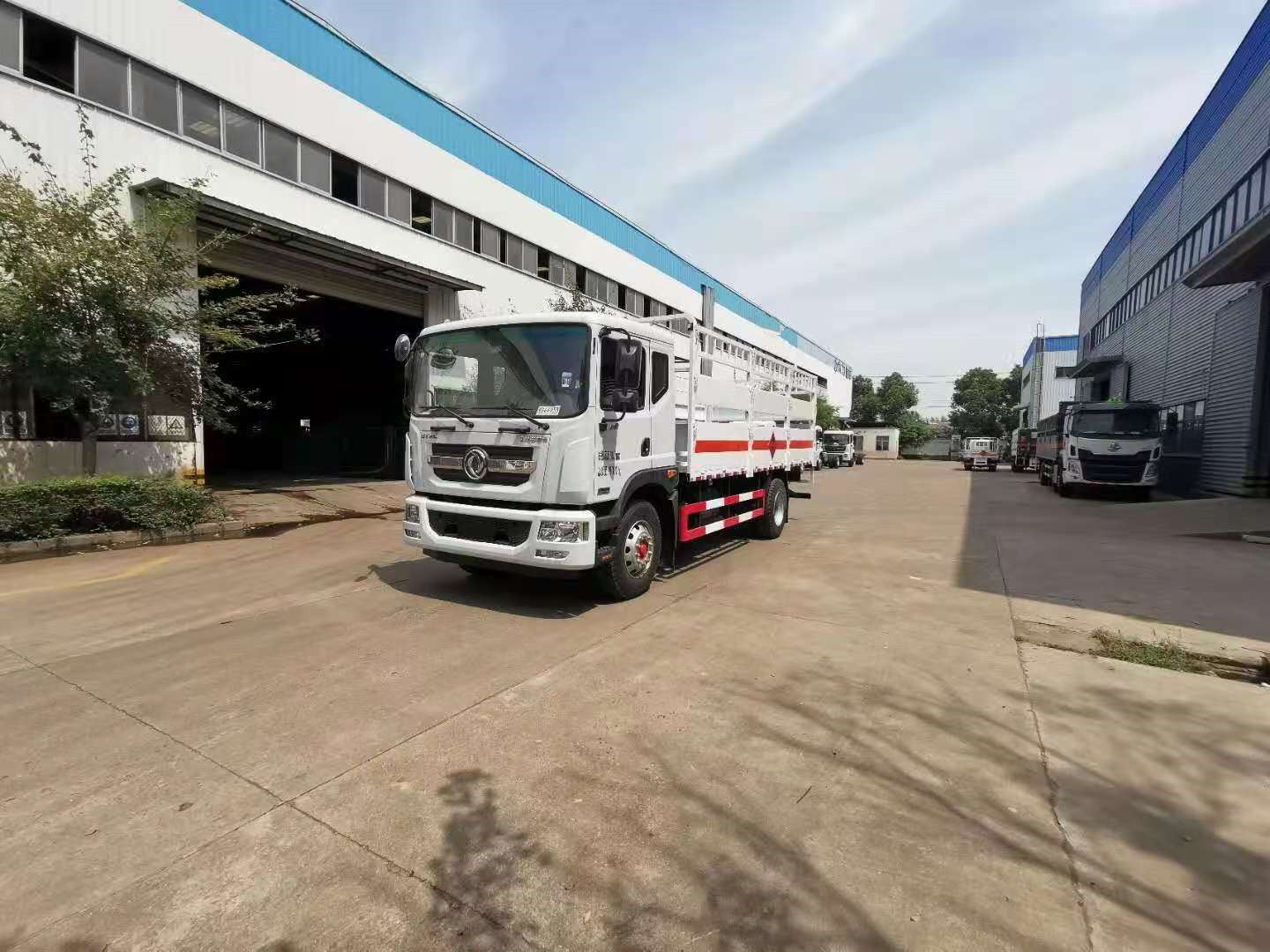 東風D9國六氣瓶運輸車采用欄板車結構,外厚度為1.1毫米厚度武鋼冷軋鋼板(或沖壓成瓦楞板,以公告為準),內加強“幾”字型加強梁,車體底板加強處理并做防靜電處理。車體的左側、右側,和后欄板栓鉤結構,可向下打開,方便上下貨物,車體為密封廂式車型,大大減少了運輸物品因為狹窄空和強烈碰撞產生氣瓶爆炸的危險性,箱體外觀涂裝白色油漆,在欄板的中間位置粘貼橙色的危化車標帶,并在車體的左、右、后部粘貼“易燃氣體”字標識。駕駛室內部配備兩只滅火器,后保險杠處安裝防追尾事故的緩沖固定塊。此款車輛屬于國家規定的危險品二類危險品運輸車。