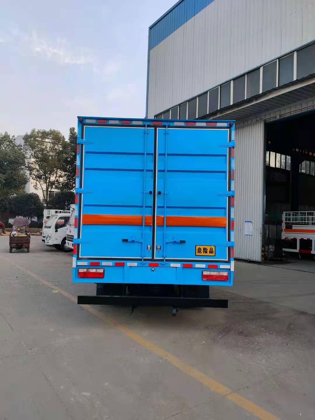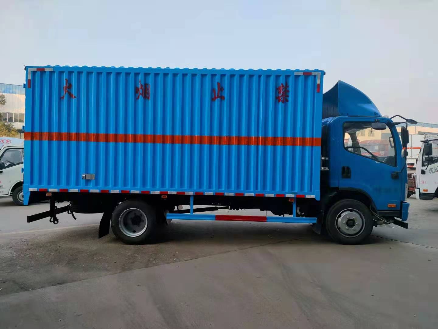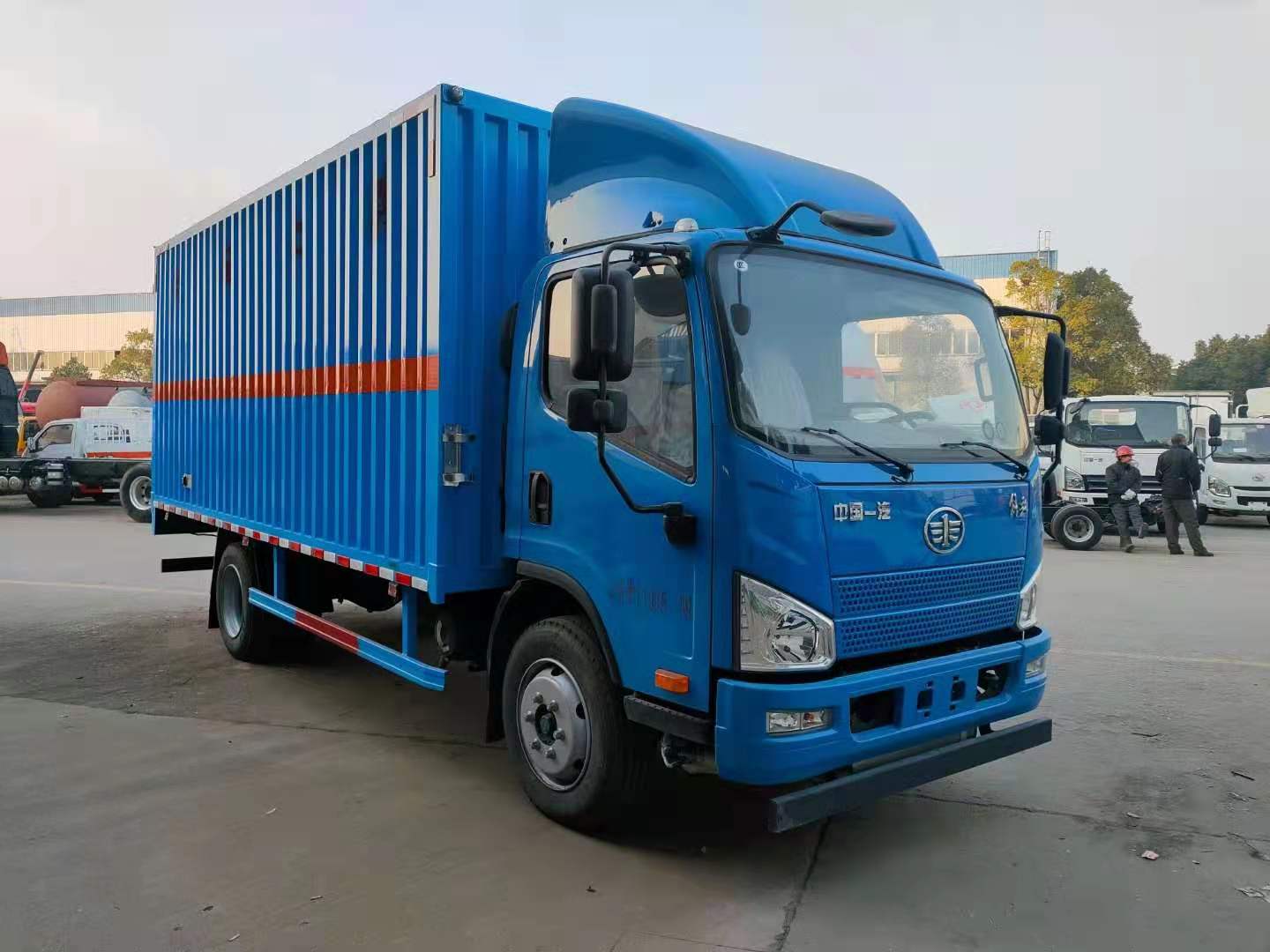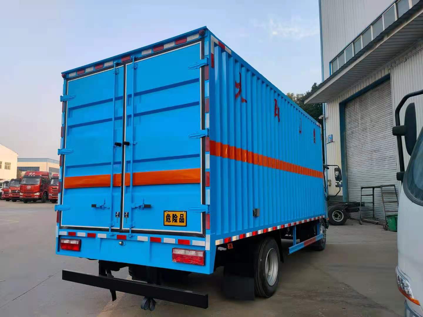 解放J6F藍色黃牌易燃氣體廂式運輸車整車型號:CA5129XRQP40K2L2E5A84型解放J6F(國五)黃牌易燃氣體廂式運輸車,貨廂尺寸(可選):5150×2170、2300×2100、2300(mm);整車尺寸(可選):6998×2300、2420×3180、3380 (mm)。總質(zhì)量:11995?kg,整備質(zhì)量:4400?kg,額定載質(zhì)量:7400?kg。廂體生產(chǎn)工藝:廂體為瓦楞板結(jié)構(gòu);底板上鋪防靜電膠皮;廂體內(nèi)加裝安全防盜報警器、煙火探測報警器;其他按標配配備:靜電帶、安全告示牌、危險品銘牌、反光標示及警告標志、滅火器、危險品頂燈、防火罩;嚴格按照國家公告尺寸、圖片等要求生產(chǎn)。采用CA1129P40K2L2BE5A84型危險品運輸專用底盤,軸距3900(mm),155馬力大柴發(fā)動機:CA4DD1-15E5,排氣管前置,前軸裝盤式制動器,裝限速裝置, 裝防抱制動(ABS);方向助力、原廠空調(diào)。