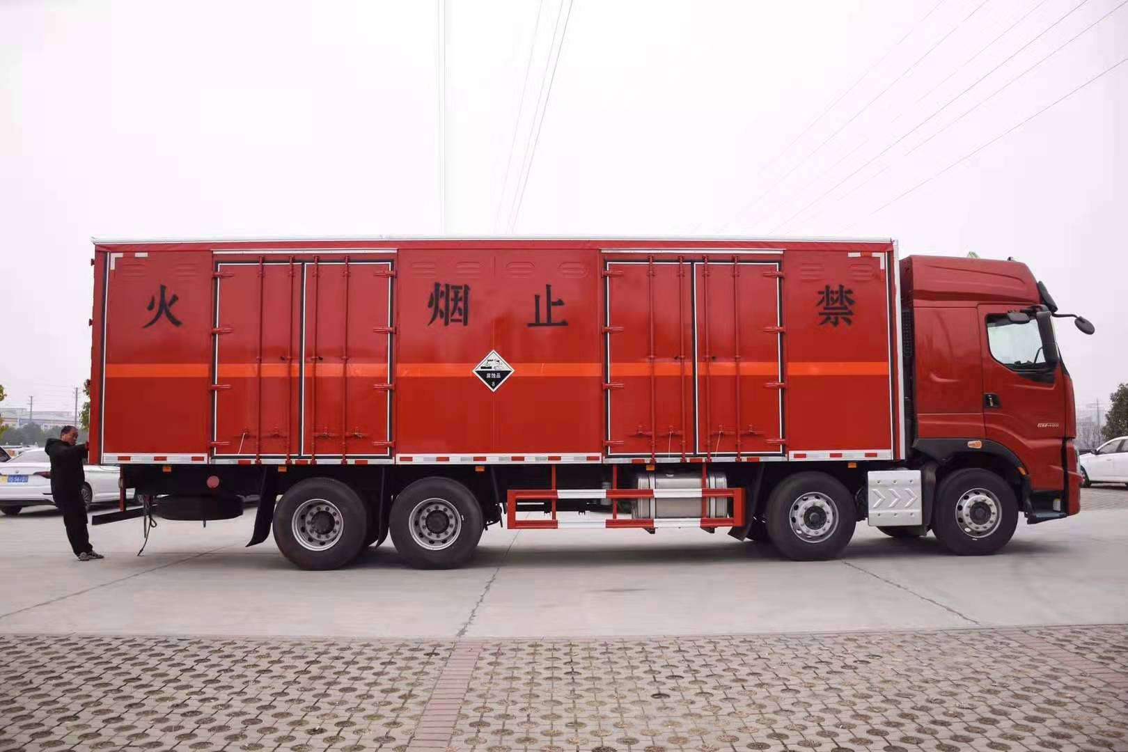 柳汽乘龍前四后八翼展危險品車嚴格按照公告尺寸制作,外板采用1mm厚冷軋板有一次性成型的百葉窗,內飾為導電性能良好的鋁板有透氣孔,內襯為矩形管骨架牢靠穩定,內部填充為透氣防潮阻燃的擠塑板,四種材料經現代工藝復合而成,廂體外部上下鋁合金型材包邊,底板和車廂前下部鋪橡膠皮,后門雙開,右側中部單開門,霧報警器和門防盜報警器,嚴格按照國家危險品相關法規張貼。