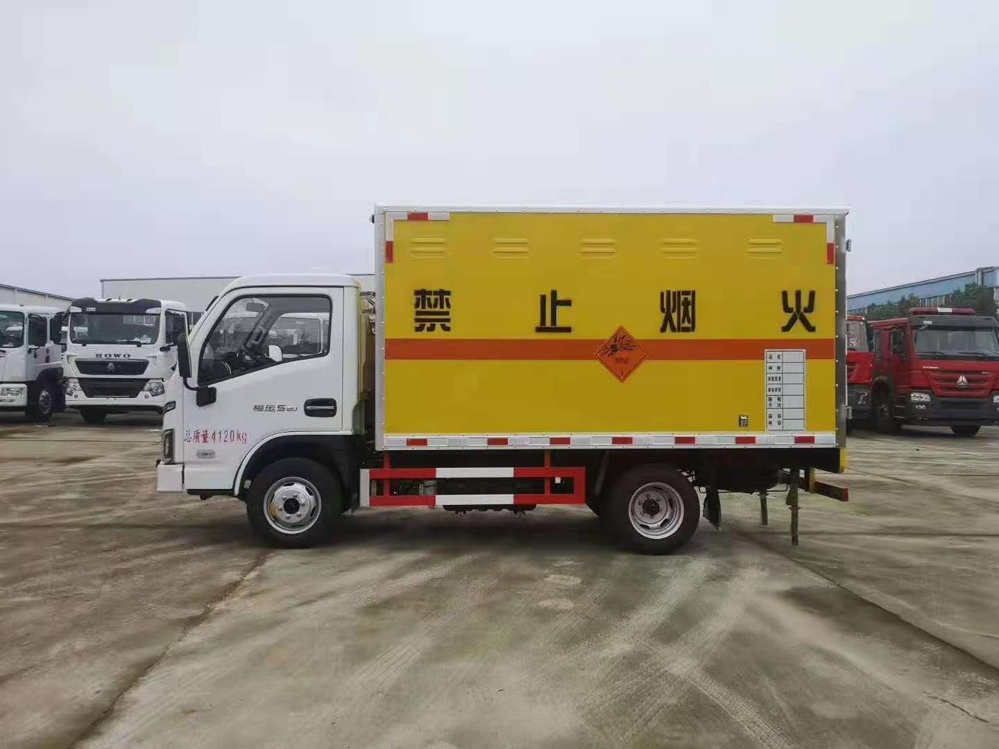 躍進國六柴油S80危險品車整車尺寸5150,5050×1895,1840,1790×2710,2610,2460,廂體尺寸3350,3100×1750,1690×1740,1650,1500,總質(zhì)量4120kg,額載質(zhì)量1700kg,廂體為雙層金屬結(jié)構(gòu),外板采用靜電屏蔽冷軋鋼板,中間填充B1級阻燃泡沫,內(nèi)飾為鋁板。廂體上側(cè)安裝防雨通風透氣孔。底板為平板,上鋪防靜電膠皮,廂體右側(cè)中開側(cè)門。廂內(nèi)兩側(cè)加裝固定貨物臥環(huán),門框帶防盜報警器,頂部帶煙霧報警器。