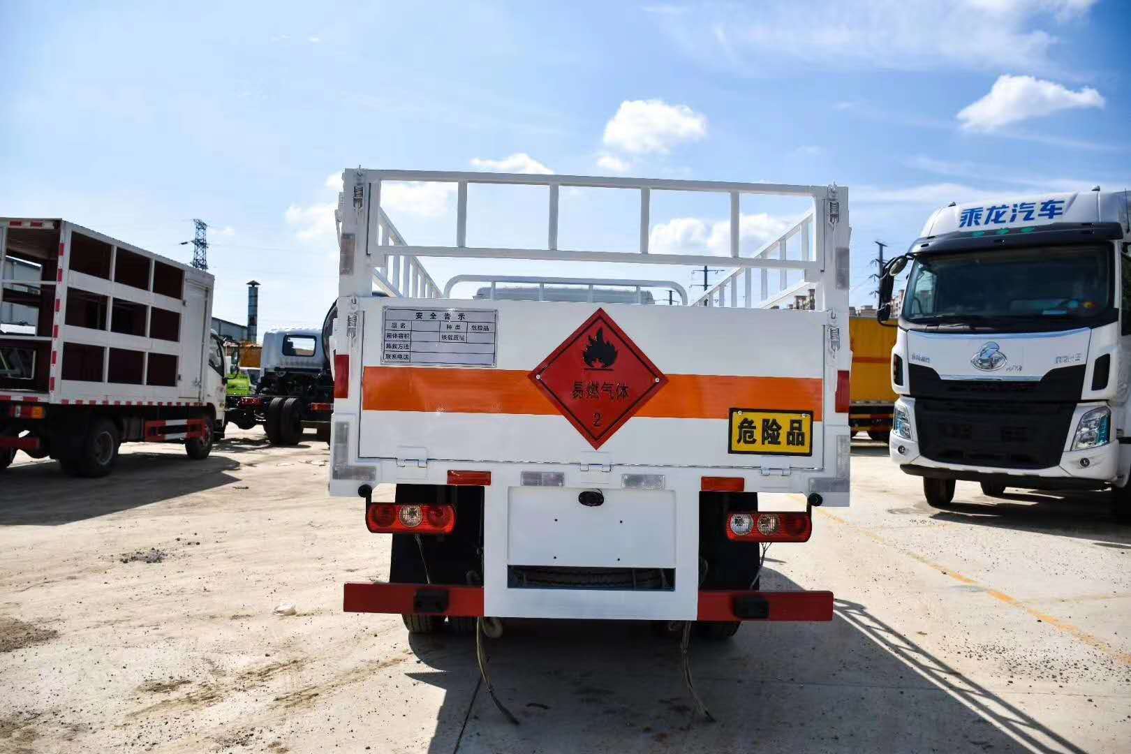 躍進3米3柴油氣瓶運輸車廂體為欄板結構,欄板可向下放倒。配置兩個滅火器,并有“嚴禁煙火”和“易燃氣體”等字樣,廂體周邊貼反光標識。后門貼有安全告示,危險品標牌。車輛尾部副梁安裝兩條拖地導靜電帶,駕駛室頂部裝有安全三角燈。廂體顏色可定制:黃、白、灰色等。