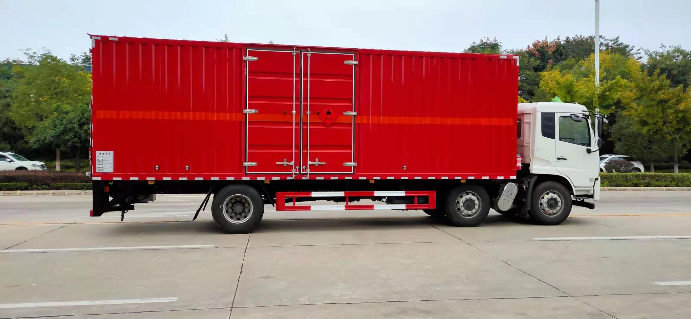 東風天錦三軸9米易燃液體廂式運輸車嚴格按照公告尺寸制作,外板采用 1mm 厚冷軋板有一次性成型的百葉窗,內飾為導電性能良好的鋁板有透氣孔,內襯為矩形管骨架牢靠穩定,內部填充為透氣防潮阻燃的擠塑板,四種材料經現代工藝復合而成,廂體外部上下鋁合金型材包邊,底板和車廂前下部鋪橡膠皮,后門雙開,右側中部兩個雙開門,內部有固定貨物的臥環,車輛外部有靜電帶、滅火器、防火罩,車廂內安裝煙霧報警器和門防盜報警器,嚴格按照國家危險品相關法規張貼。