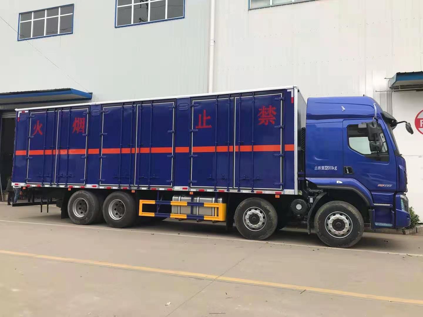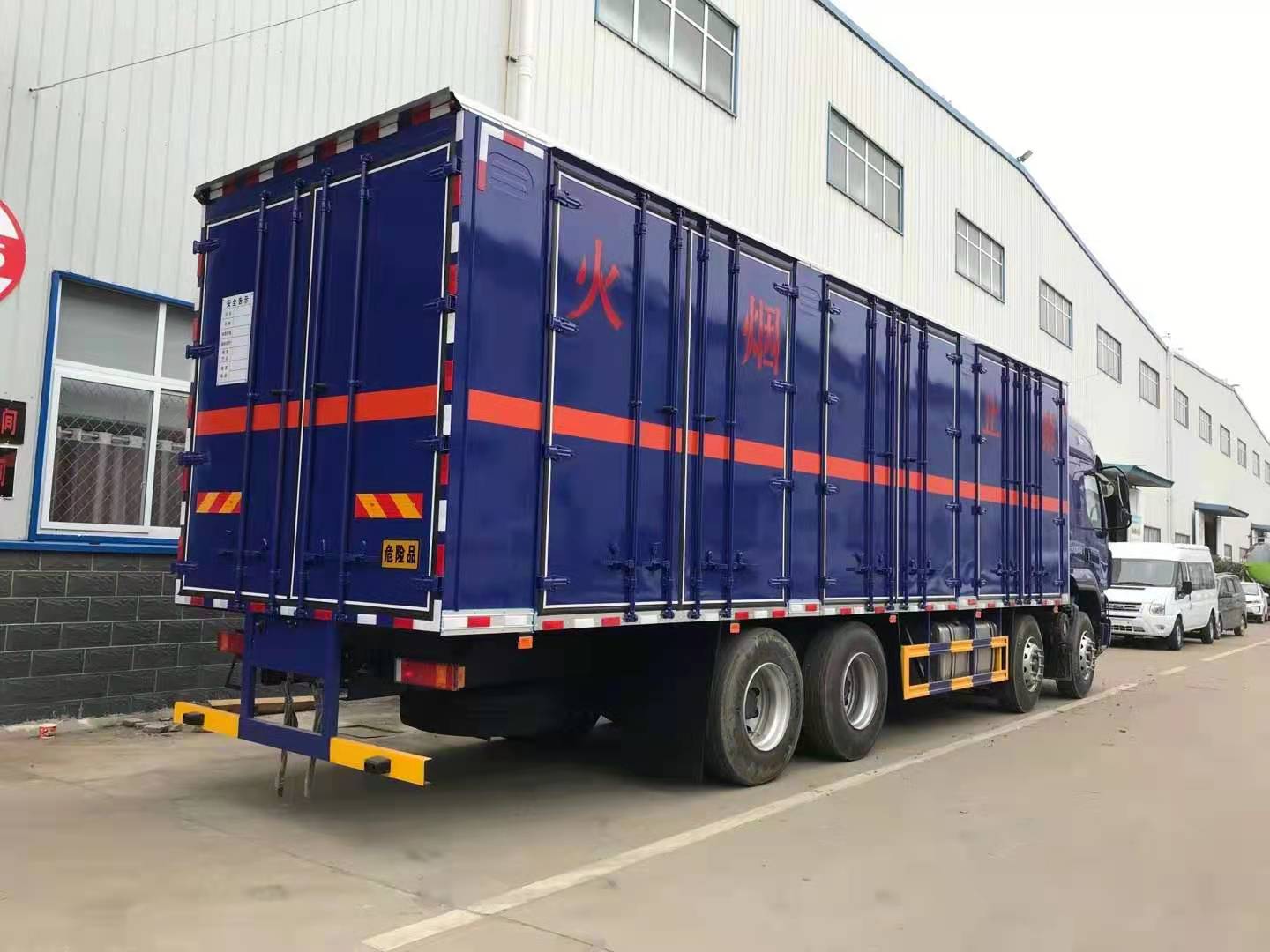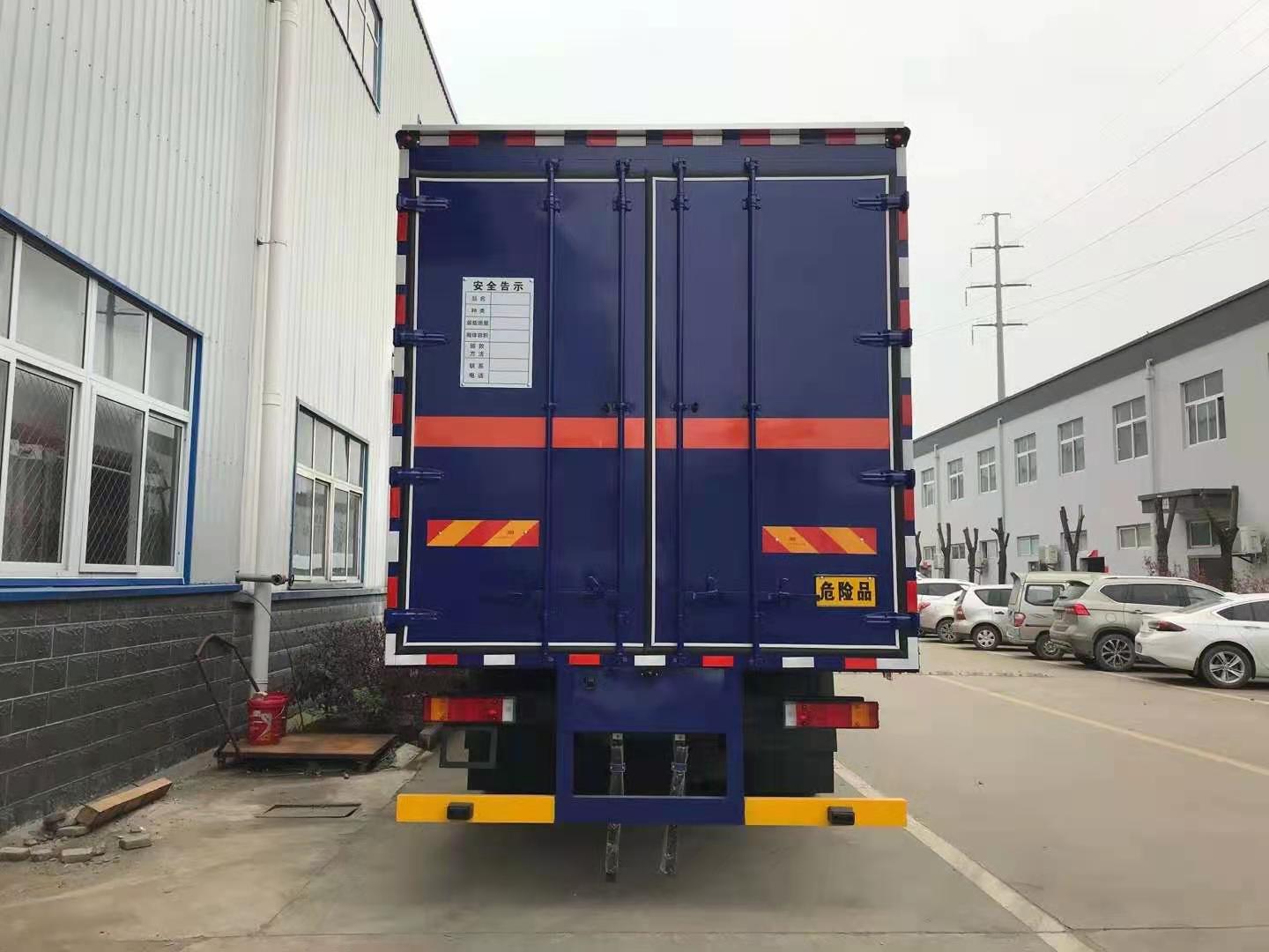 柳汽乘龍前四后八帶三開側門危險品車嚴格按照公告尺寸制作,外板采用 1mm 厚冷軋板有一次性成型的百葉窗,內飾為導電性能良好的鋁板有透氣孔,內襯為矩形管骨架牢靠穩定,內部填充為透氣防潮阻燃的擠塑板,四種材料經現代工藝復合而成,廂體外部上下鋁合金型材包邊,底板和車廂前下部鋪橡膠皮,后門雙開,右側中部兩個雙開門,內部有固定貨物的臥環,車輛外部有靜電帶、滅火器、防火罩,車廂內安裝煙霧報警器和門防盜報警器,嚴格按照國家危險品相關法規張貼。廂體內部安裝便于可固定貨物的卡槽,底板為3mm鋼板上面鋪防靜電膠皮,靜電拖地帶,滅火器兩個,危險品三角頂燈,防火帽,廂體顏色白色,其他嚴格按公告制作。 底板為3mm鋼板上面鋪防靜電膠皮,靜電拖地帶,滅火器兩個,危險品三角頂燈,防火帽,廂體顏色白色,其他嚴格按公告制作。