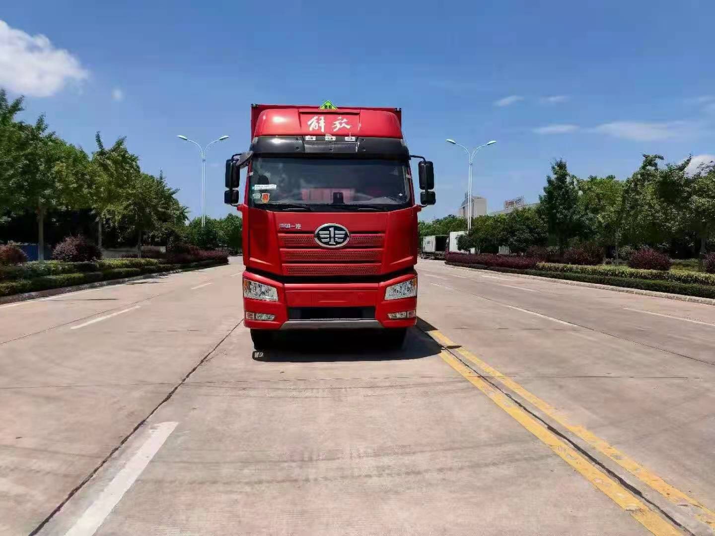 解放國六9米5易燃液體廂式運輸車底盤配置:新J6P高頂排半駕駛室、電動玻璃、電動后視鏡、空氣減振座椅、單DIN北斗兼容車載系統(觸摸屏),大柴320P,Ф430離合器,解放9檔變速器(全鋁殼體),Ф435沖焊橋,速比:3.727,12R22.5 18PR輪胎,鋁合金輪輞,自動空調、駕駛室四點空氣懸置、300L鋁油箱、EBS(制動控制系統)、ESC(電子穩定)、TPMS(胎壓檢測)、FCW(前碰預警)、LDW(車道偏離報警)。軸距:1900+4500+1350MM。