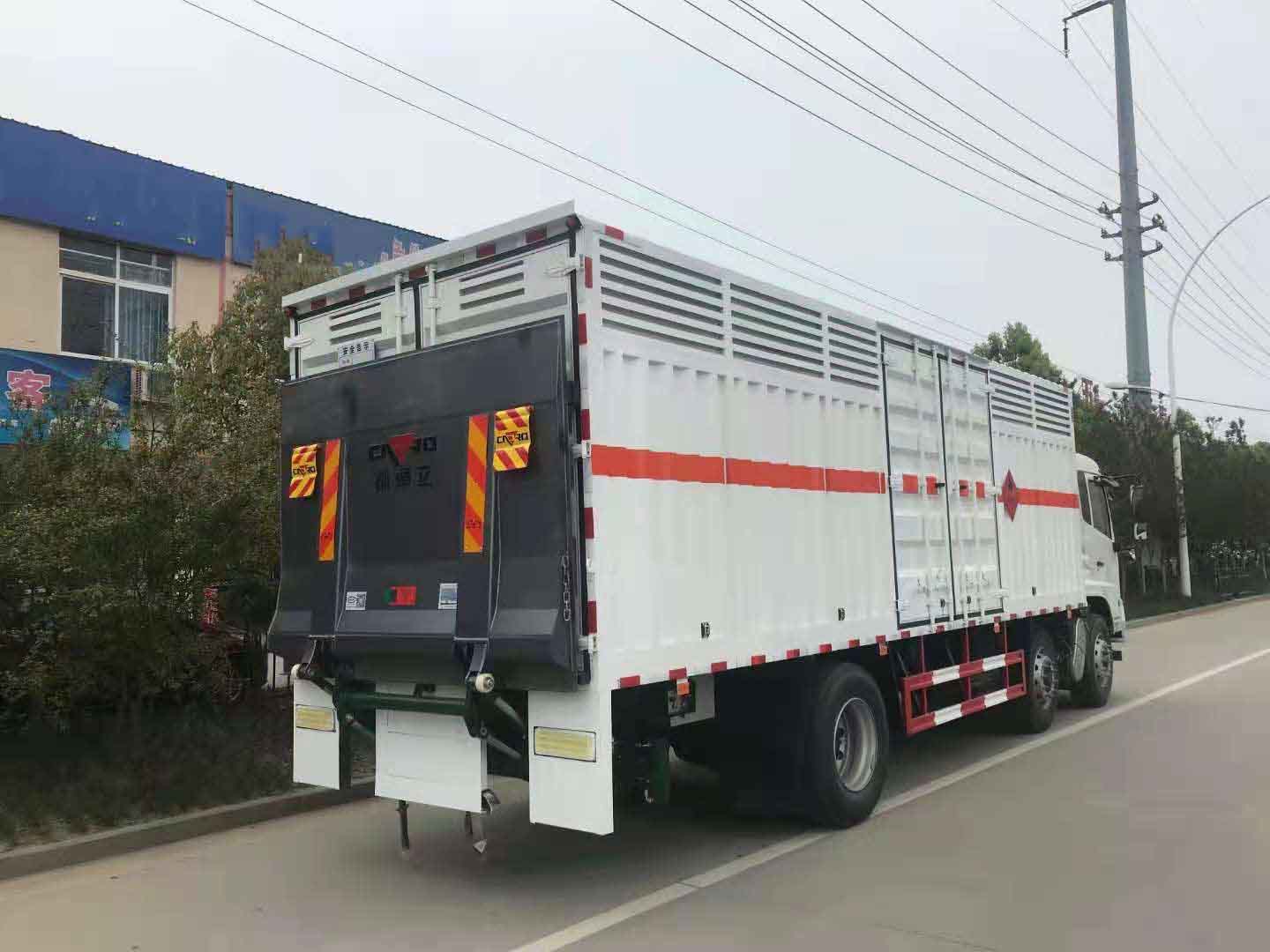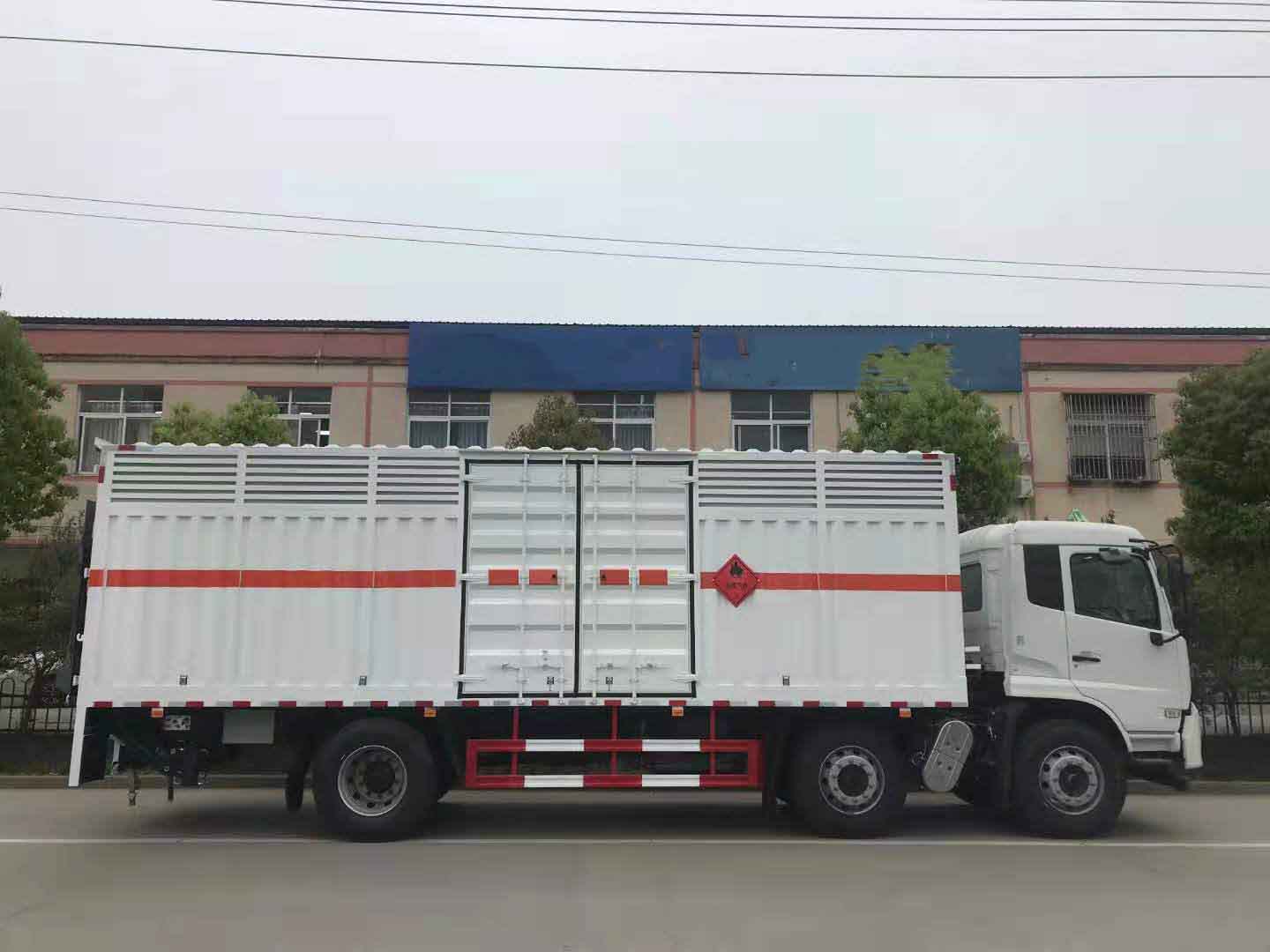 東風天錦三軸國六帶液壓尾板危險品車采用天錦D530排半駕駛室,康明斯245馬力六缸機,大同七擋變速箱,鋁合金280L油箱,帶空調,電動玻璃,行車記錄儀,空氣懸掛,排氣管前置,前盤后鼓,ABS 斷氣剎,方向助力,離合器助力,發動機制動,EBS,防碰撞預警,胎壓監測,盲區監測。 東風天錦三軸國六帶液壓尾板危險品車廂體為瓦楞板,內襯為矩形管骨架牢靠穩定,廂體外部上下鋁合金型材包邊,底板和車廂前下部鋪橡膠皮,后門雙開,右側中部兩個雙開門,內部有固定貨物的臥環,車輛外部有靜電帶、滅火器、防火罩,車廂內安裝煙霧報警器和門防盜報警器,嚴格按照國家危險品相關法規張貼。廂體外帶透氣孔,加裝液壓尾板不超重。