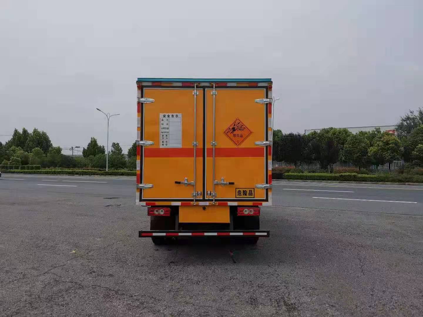 新規(guī)福田藍牌爆破運輸車采用福田危險品車專用底盤,國六排放,3360mm軸距,全柴130馬力發(fā)動機,帶原裝空調(diào),5檔變速箱,后雙輪,中控門鎖,電動門窗。體為雙層金屬結(jié)構(gòu),外板采用靜電屏蔽冷軋鋼板,中間填充B1級阻燃泡沫,內(nèi)飾為鋁板。廂體上側(cè)安裝防雨通風透氣孔。底板為花紋板(或平板),上鋪防靜電膠皮,廂體右側(cè)中開單側(cè)門。廂內(nèi)兩側(cè)加裝固定貨物臥環(huán),門框帶防盜報警器,頂部帶煙霧報警器。配備隨車工具,2個滅火器,三角頂燈,2條防靜電拖帶,貼反光標識等。其他按公告標準制作。