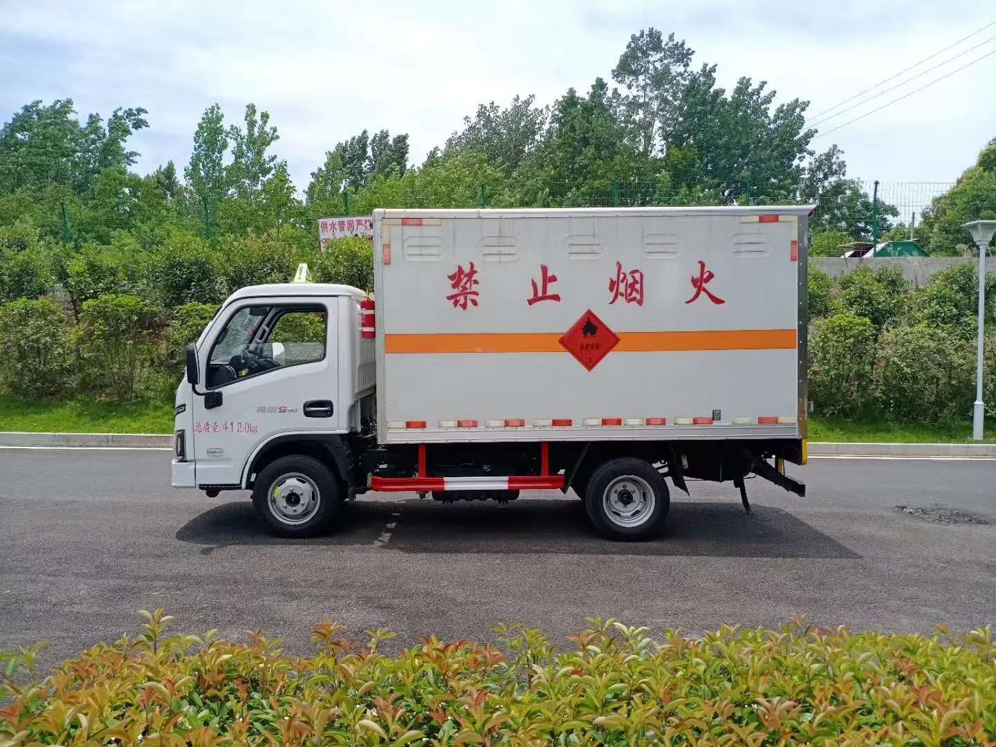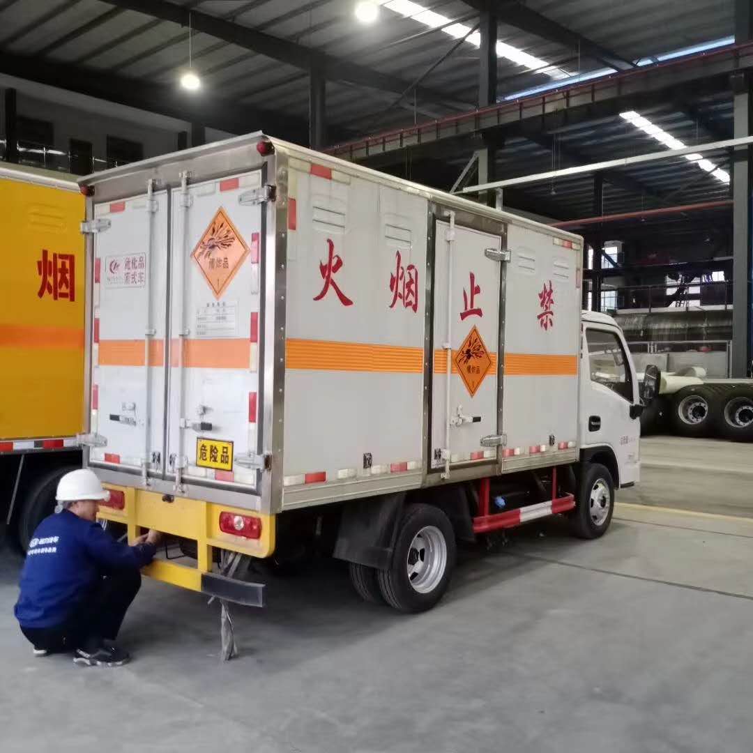 躍進國六柴油S80危險品車整車尺寸5150,5050×1895,1840,1790×2710,2610,2460,廂體尺寸3350,3100×1750,1690×1740,1650,1500,總質量4120kg,額載質量1700kg,廂體為雙層金屬結構,外板采用靜電屏蔽冷軋鋼板,中間填充B1級阻燃泡沫,內飾為鋁板。廂體上側安裝防雨通風透氣孔。底板為平板,上鋪防靜電膠皮,廂體右側中開側門。廂內兩側加裝固定貨物臥環(huán),門框帶防盜報警器,頂部帶煙霧報警器。