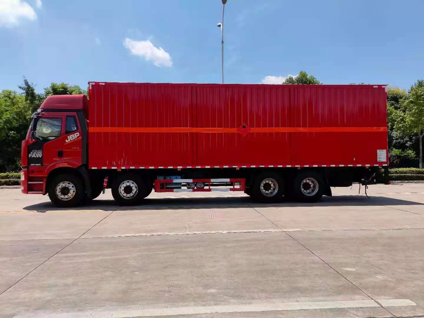 新款解放前四后八320馬力易燃液體廂式運輸車可選瓦楞廂體也可選復合板廂體,加裝液壓尾板不超重,歡迎各新老客戶來電咨詢訂購!
