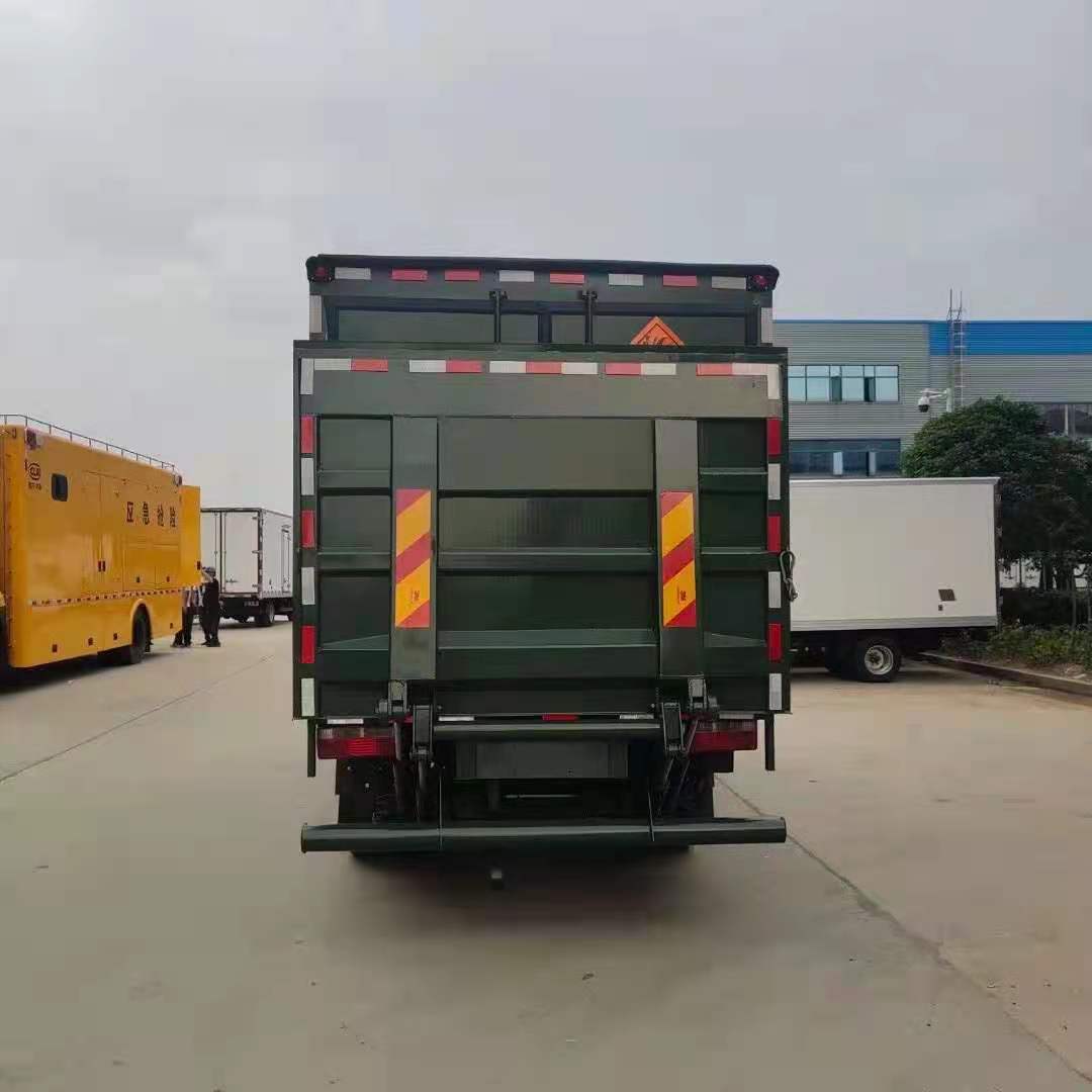 解放虎V軍綠色帶液壓尾板防爆車采用解放虎V專用危險品車底盤,一汽6檔變速箱,295H后橋,7.00R16真空胎,180大梁滿,帶多功能方向盤,150L鋁合金油箱,板簧3/7+9,帶國產ABS,定速巡航,高架箱,空調+電動門窗+中控鎖,儀表EOL,液晶儀表,鋁合金儲氣筒,后處理器前置+排氣火花熄滅器+前盤后鼓制動器+限速79KM/H,北斗+GPRS行車記錄儀,取力器預留安裝位置與排煙管異側,爆胎應急安全裝置,20L尿素箱。