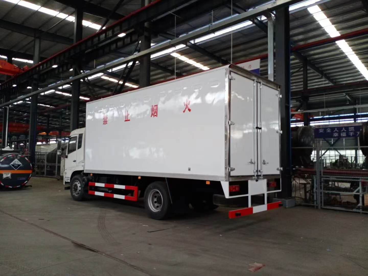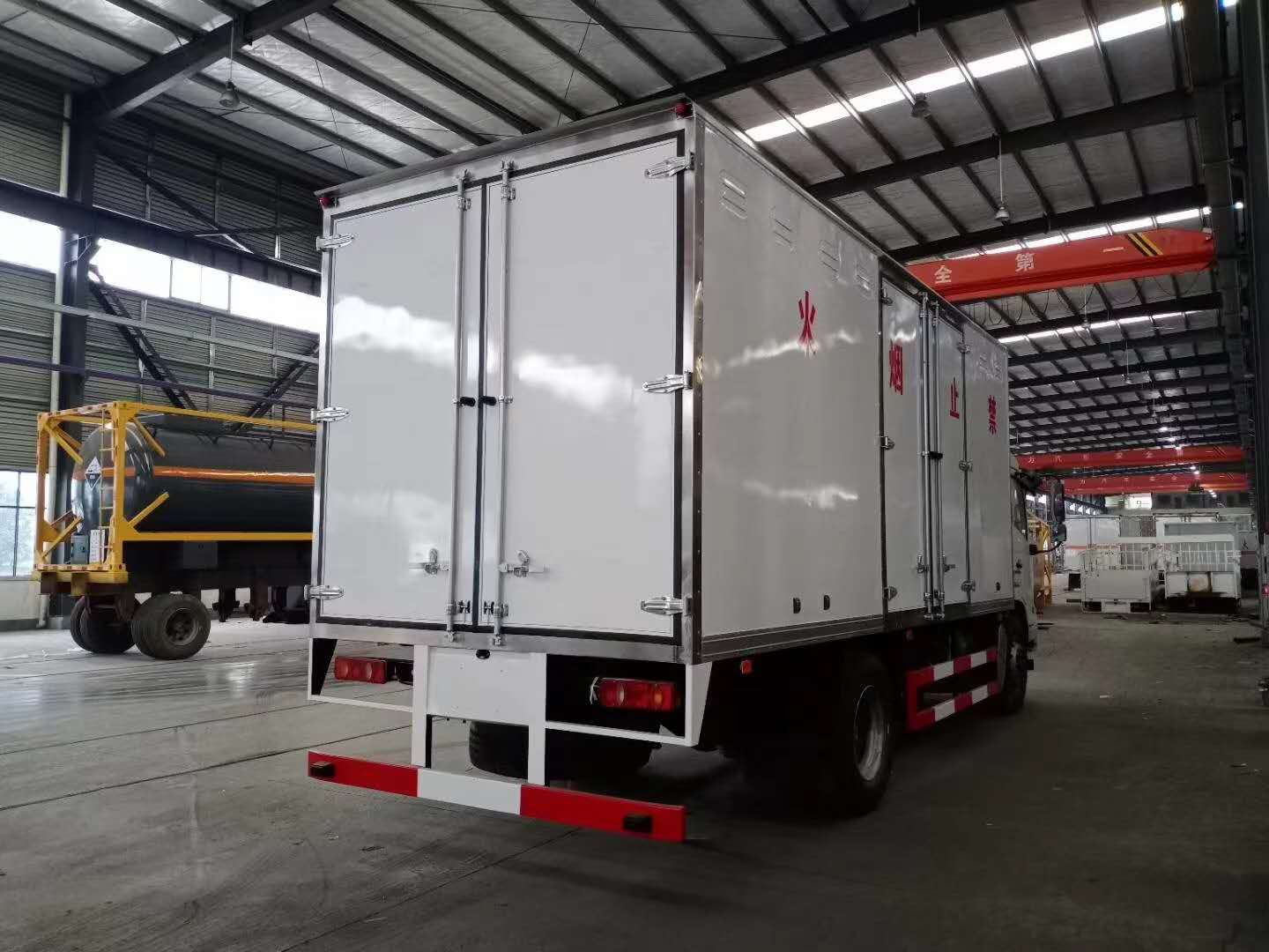 東風(fēng)天錦國六6米2爆破器材運輸車廂體配置:外飾冷軋鋼板,內(nèi)飾鋁合金板,中間填充隔熱阻燃材料,廂體兩側(cè)上方設(shè)有防雨功能自然通風(fēng)窗口,底部鋪有阻燃導(dǎo)靜電膠板,廂體側(cè)面裝有固定拉環(huán),與捆綁帶使用捆綁貨物以避免移動。在車廂內(nèi)頂部安裝感煙報警器,在門器框上方安裝有防盜報警器,廂體外側(cè)安裝示廓燈及滅火器支架,配置兩個滅火器,并有“嚴(yán)禁煙火”和“爆”等字樣,廂體周邊貼反光標(biāo)識。后門貼有安全告示,危險品標(biāo)牌。車輛尾部安裝兩條拖地導(dǎo)靜電膠帶,駕駛室頂部裝有安全三角燈。廂體顏色有:黃、白、灰色等可選。