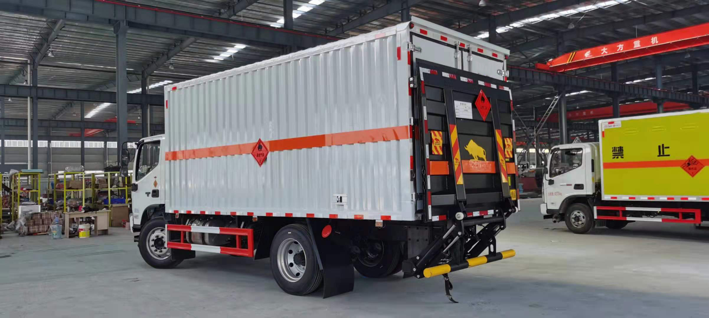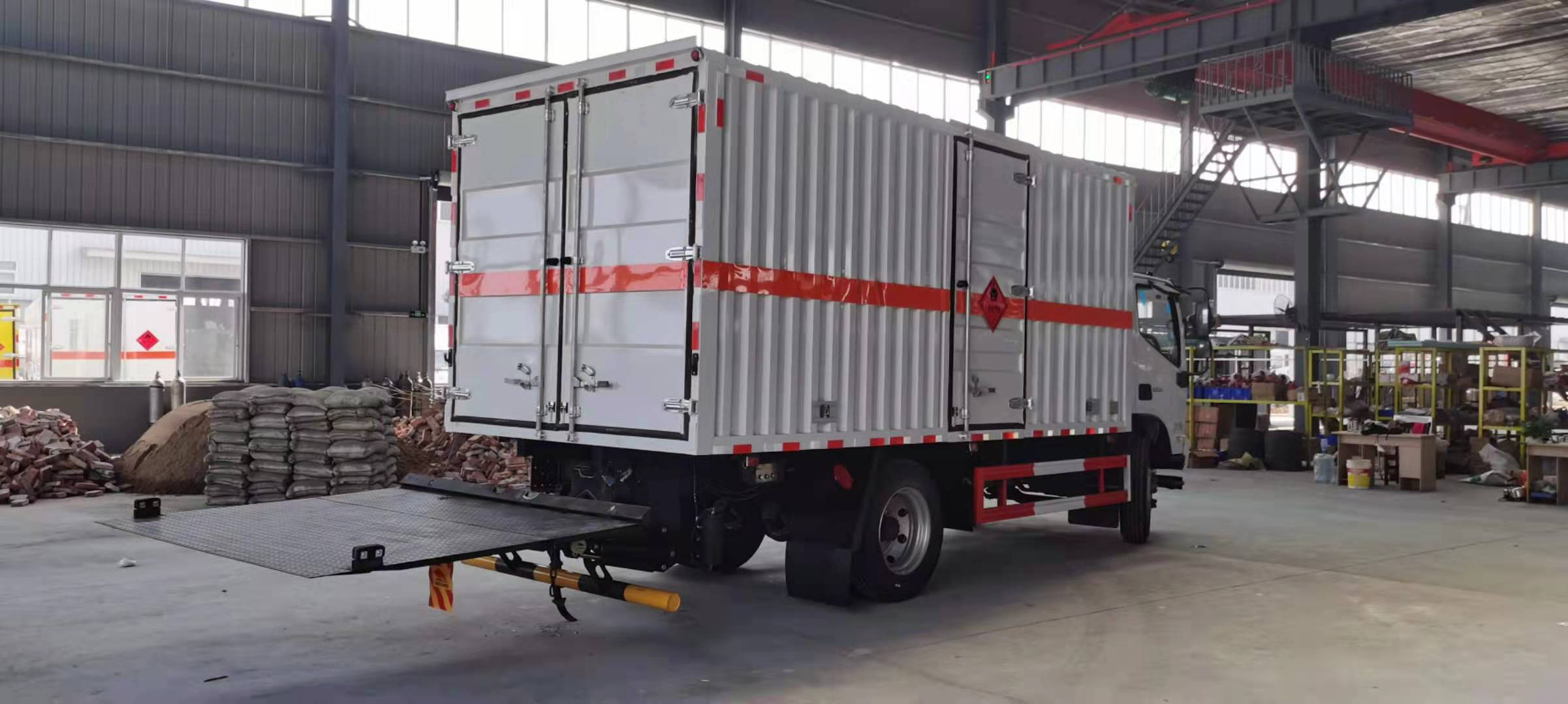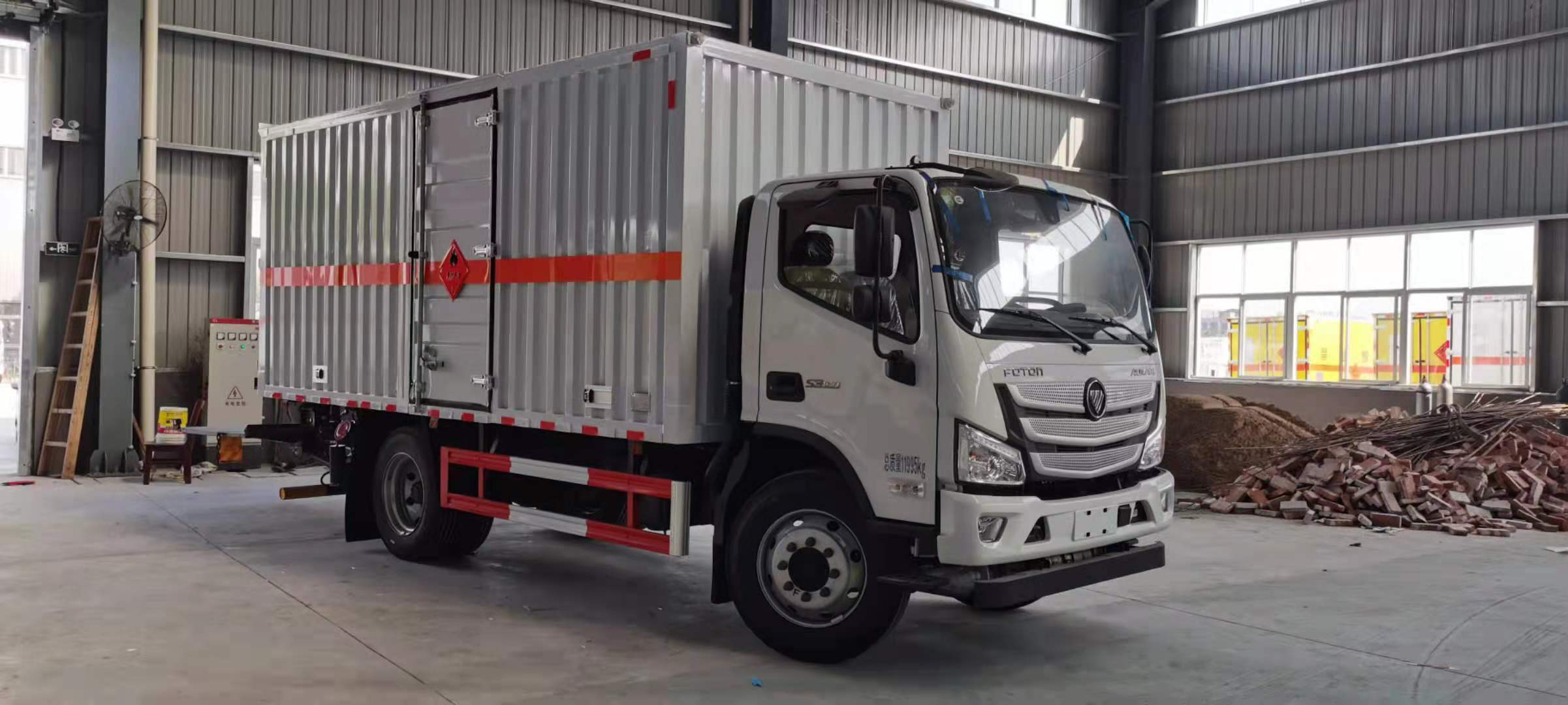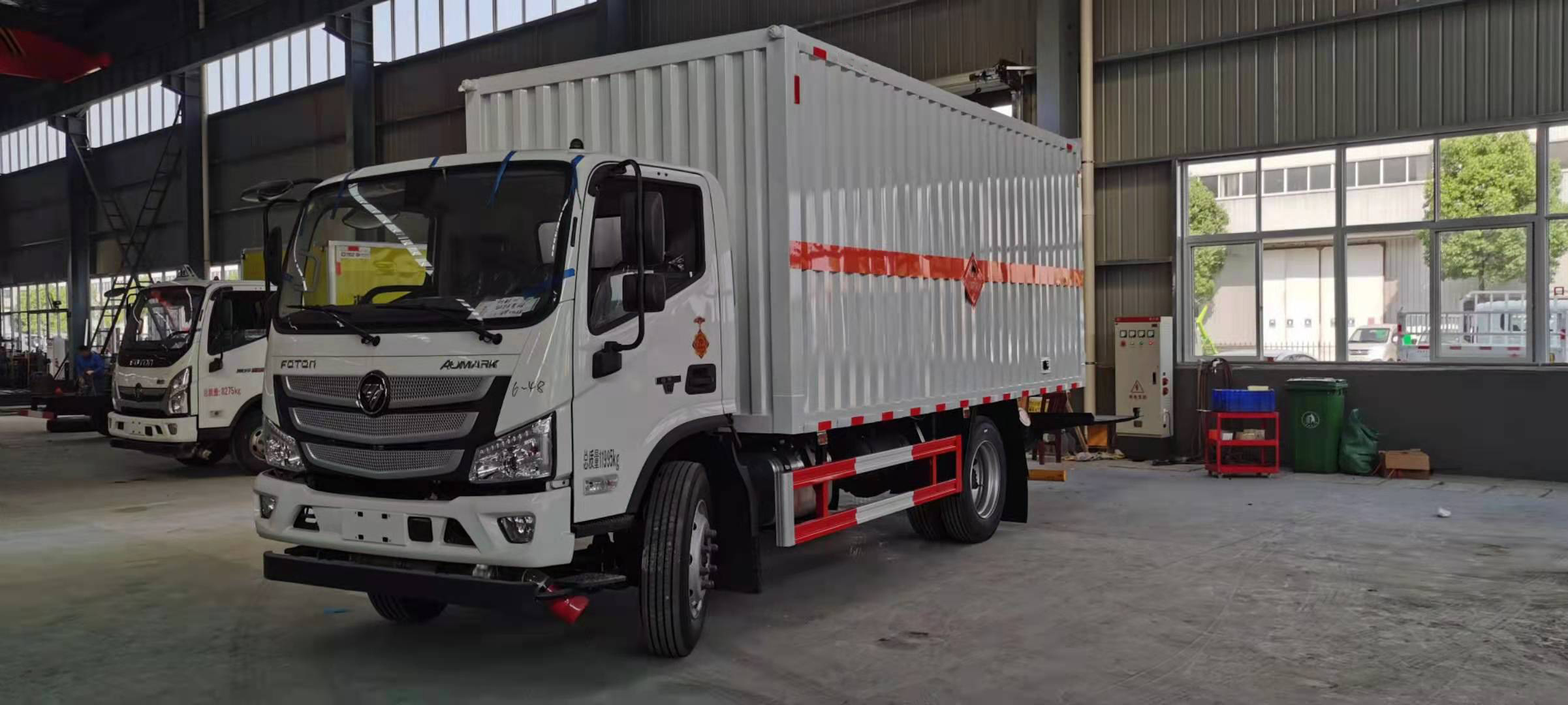 福田歐馬可3.8排量156馬力國六5米1危險品車沖壓成瓦楞板,以公告為準(zhǔn)),內(nèi)加強“幾”字型加強梁,車體底板加強處理并做防靜電處理。車體的左側(cè)、右側(cè),和后欄板栓鉤結(jié)構(gòu),可向下打開,方便上下貨物,車體為空曠式車型,大大減少了運輸物品因為狹窄空和強烈碰撞產(chǎn)生氣瓶爆炸的危險性,箱體外觀涂裝白色油漆,在欄板的中間位置粘貼橙色的危化車標(biāo)帶,并在車體的左、右、后部粘貼“易燃?xì)怏w”或“不燃?xì)怏w”標(biāo)識。駕駛室內(nèi)部配備兩只滅火器,后杠處安裝防追尾事故的緩沖固定塊。此款車輛屬于國家規(guī)定的危險品二類危險品運輸車。