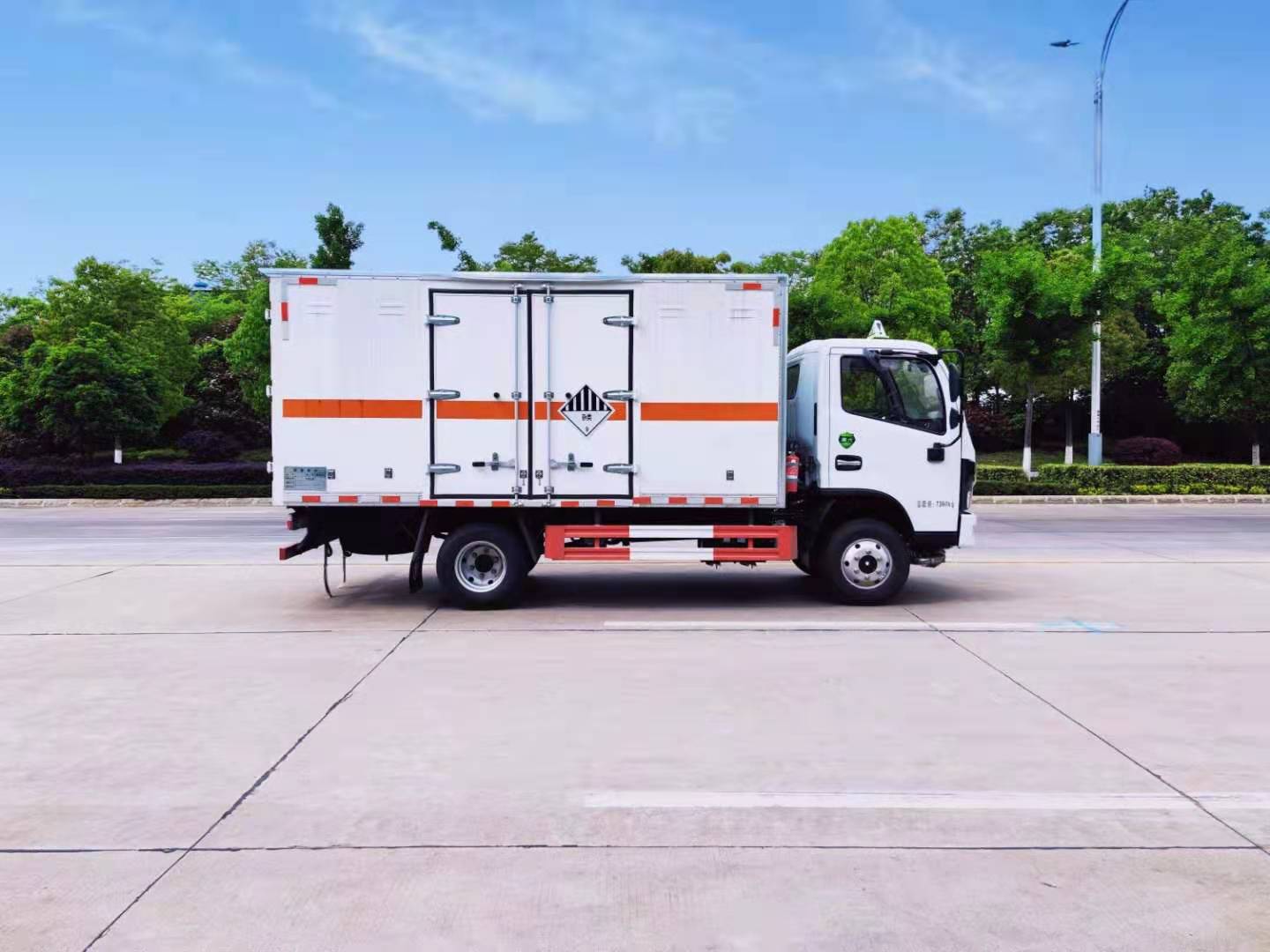 東風福瑞卡國六雜項危險品車外板采用1mm厚冷軋板有一次性成型的百葉窗,內飾為導電性能良好的鋁板有透氣孔,內襯為矩形管骨架牢靠穩定,內部填充為透氣防潮阻燃的擠塑板,四種材料經現代工藝復合而成,廂體外部上下鋁合金型材包邊,底板和車廂前下部鋪橡膠皮,后門雙開,右側中部單開門,車輛外部有靜電帶、滅火器、防火罩,車廂內安裝煙霧報警器和門防盜報警器,嚴格按照國家危險品相關法規張貼。
