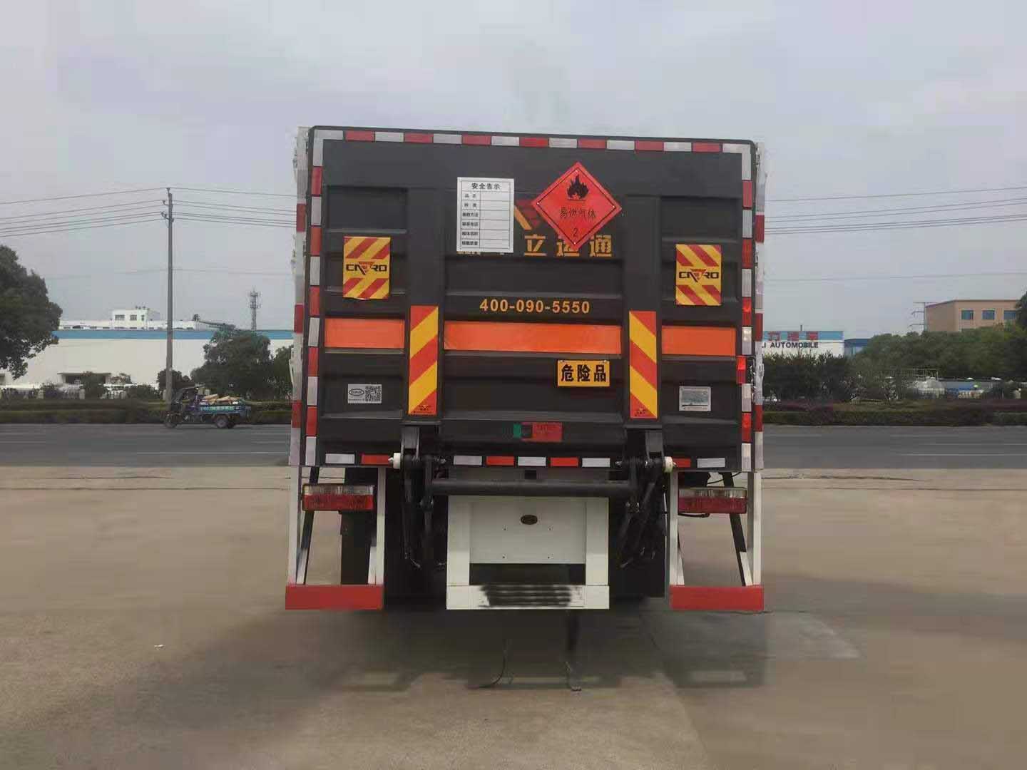 東風D9國六6米8氣瓶運輸車(低平板)采用廂式欄板車結構,外厚度為1.1毫米厚度武鋼冷軋鋼板(或沖壓成瓦楞板,以公告為準),內加強“幾”字型加強梁,車體底板加強處理并做防靜電處理。車體的左側、右側,和后欄板栓鉤結構,可向下打開,方便上下貨物,車體為空曠式車型,大大減少了運輸物品因為狹窄空和強烈碰撞產生氣瓶爆炸的危險性,箱體外觀涂裝白色油漆,在欄板的中間位置粘貼橙色的危化車標帶,并在車體的左、右、后部粘貼“易燃氣體”或“不燃氣體”標識。駕駛室內部配備兩只滅火器,后杠處安裝防追尾事故的緩沖固定塊。此款車輛屬于國家規定的危險品二類危險品運輸車。