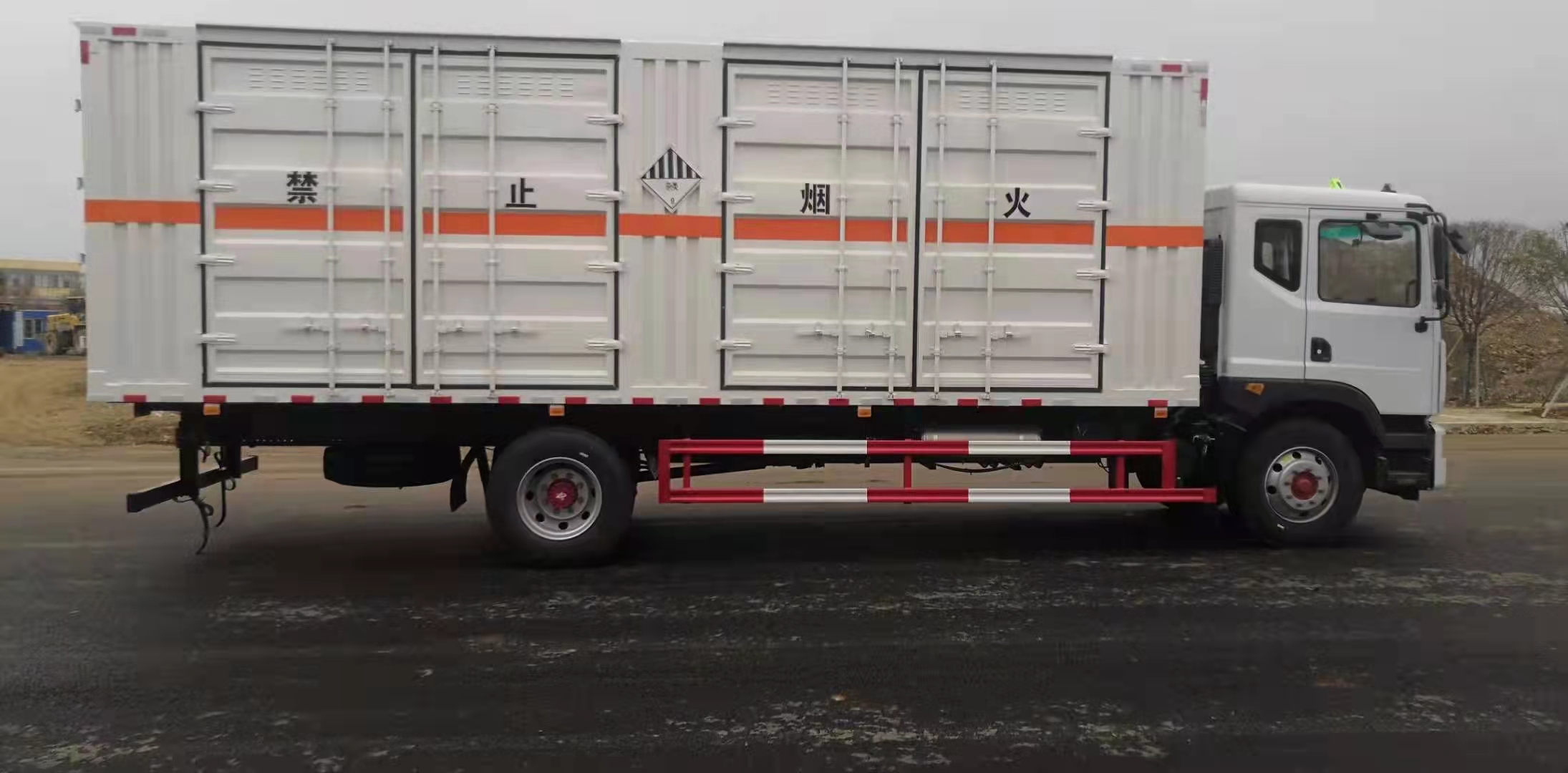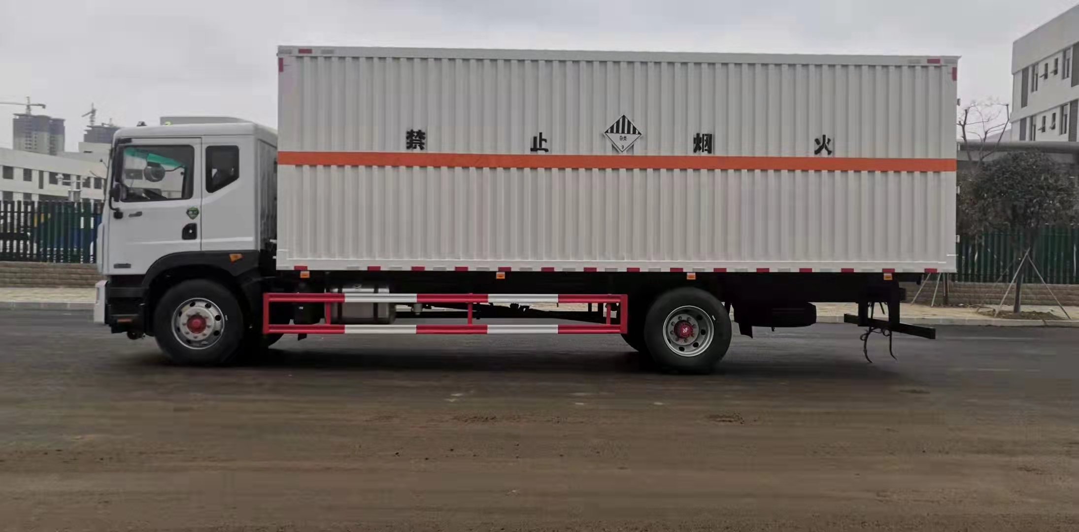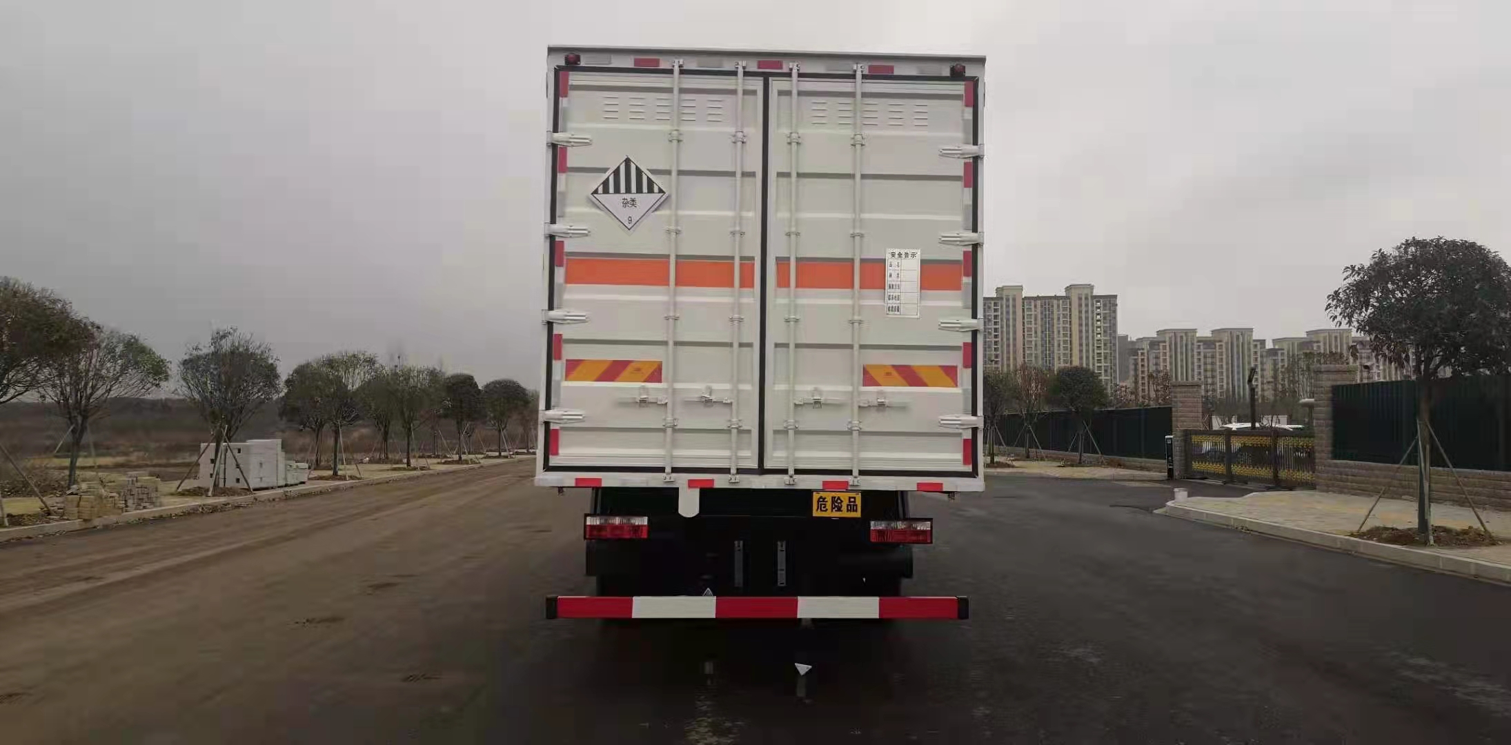 東風(fēng)多利卡D9國六瓦楞廂式運(yùn)輸車采用沖壓成瓦楞板,以公告為準(zhǔn)。內(nèi)加強(qiáng)“幾”字型加強(qiáng)梁,車體底板加強(qiáng)處理并做防靜電處理。車體的左側(cè)、右側(cè),和后欄板栓鉤結(jié)構(gòu),可向下打開,方便上下貨物,車體為空曠式車型,大大減少了運(yùn)輸物品因?yàn)楠M窄空和強(qiáng)烈碰撞產(chǎn)生氣瓶爆炸的危險(xiǎn)性,箱體外觀涂裝白色油漆,在欄板的中間位置粘貼橙色的;嚇(biāo)帶,并在車體的左、右、后部粘貼“易燃?xì)怏w”或“不燃?xì)怏w”標(biāo)識(shí)。駕駛室內(nèi)部配備兩只滅火器,后杠處安裝防追尾事故的緩沖固定塊。此款車輛屬于國家規(guī)定的危險(xiǎn)品二類危險(xiǎn)品運(yùn)輸車。
