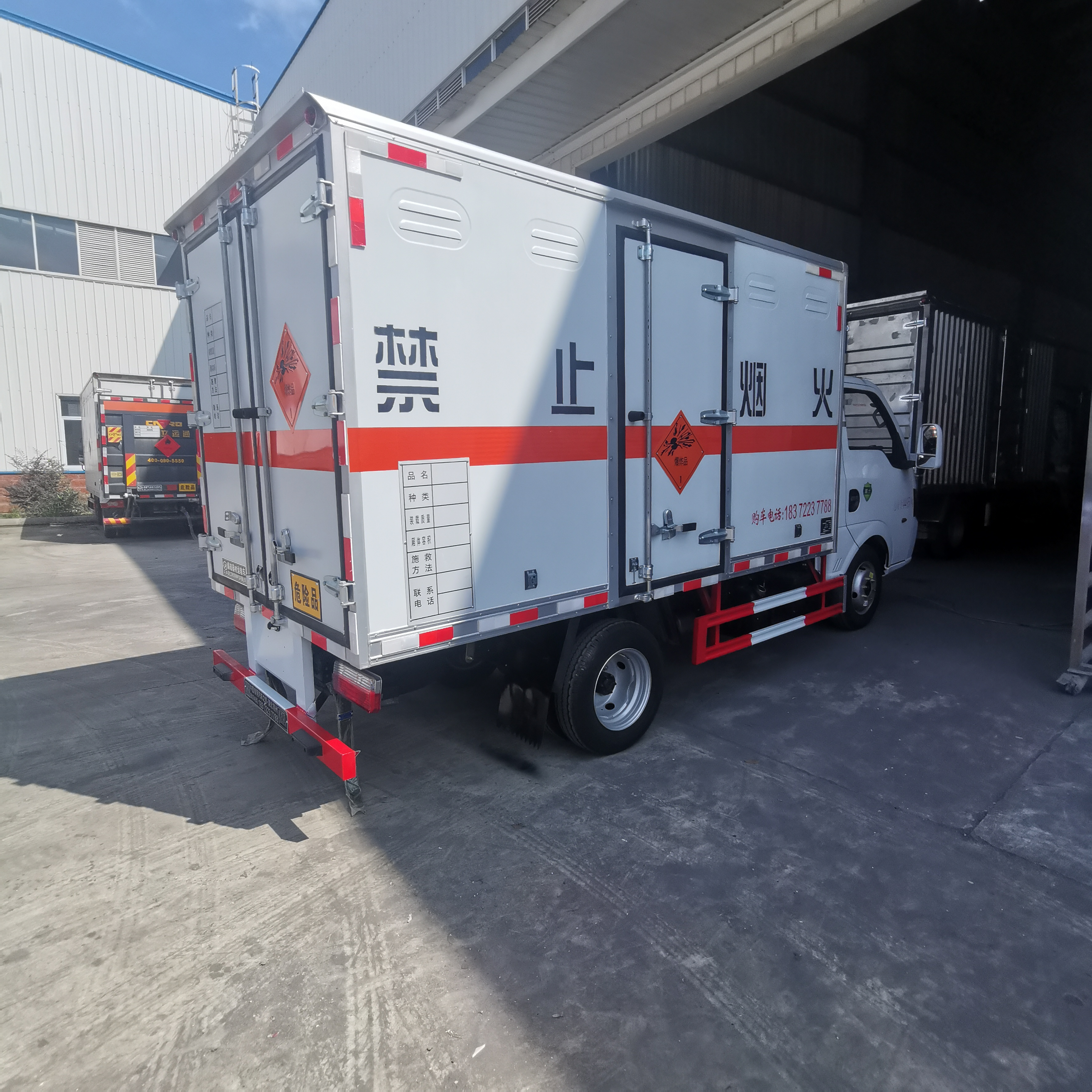 東風途逸國六帶中開側門柴油民爆車嚴格按照公告尺寸制作,外板采用1mm厚冷軋板有一次性成型的百葉窗,內飾為導電性能良好的鋁板有透氣孔,內襯為矩形管骨架牢靠穩定,內部填充為透氣防潮阻燃的擠塑板,四種材料經現代工藝復合而成,廂體外部上下鋁合金型材包邊,底板和車廂前下部鋪橡膠皮,后門雙開,右側中部單開門,霧報警器和門防盜報警器,嚴格按照國家危險品相關法規張貼。