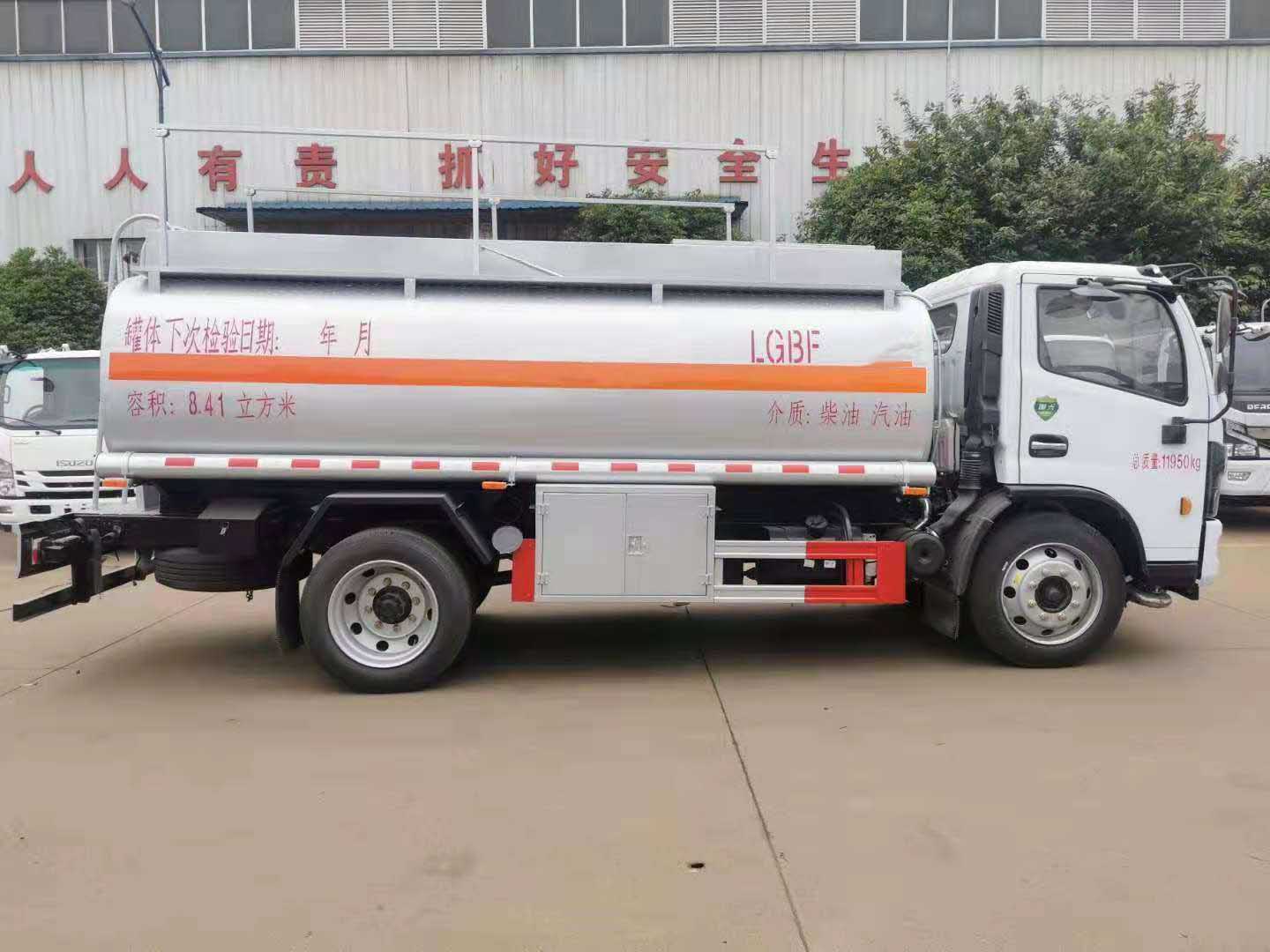 東風福瑞卡國六8噸油罐車罐體配置:筒體4.5mm厚,封頭4.5mm厚,隔板4mm厚,單倉,罐頂壹個歐標罐口, 1個鋁合金海底閥(帶自動關閉裝置),帶70/40專用油泵(可泵進泵出),正星大流量加油機和15米加粗卷盤及槍,全套歐標,后爬梯、手動護欄、工具箱、后保險杠、側防護欄,按2021年新標準制作。