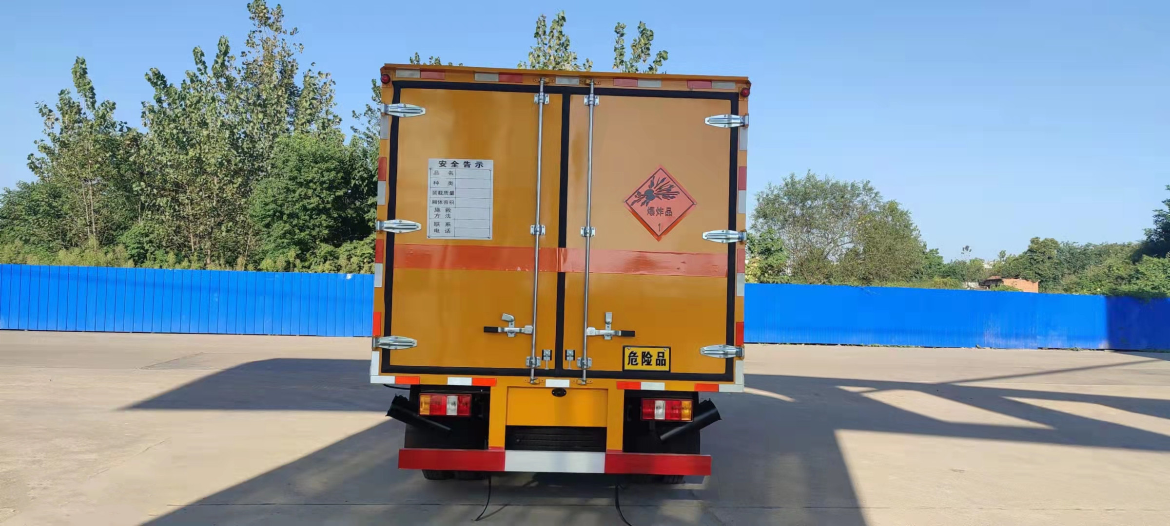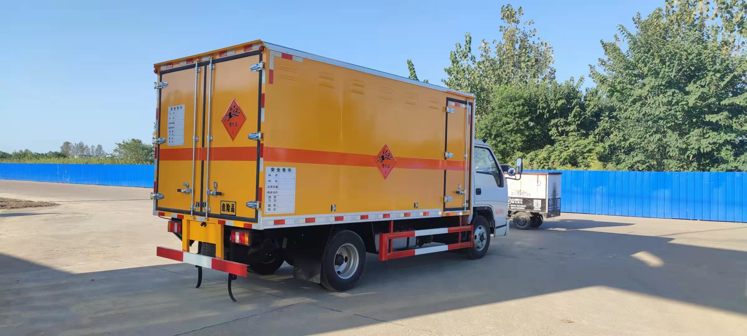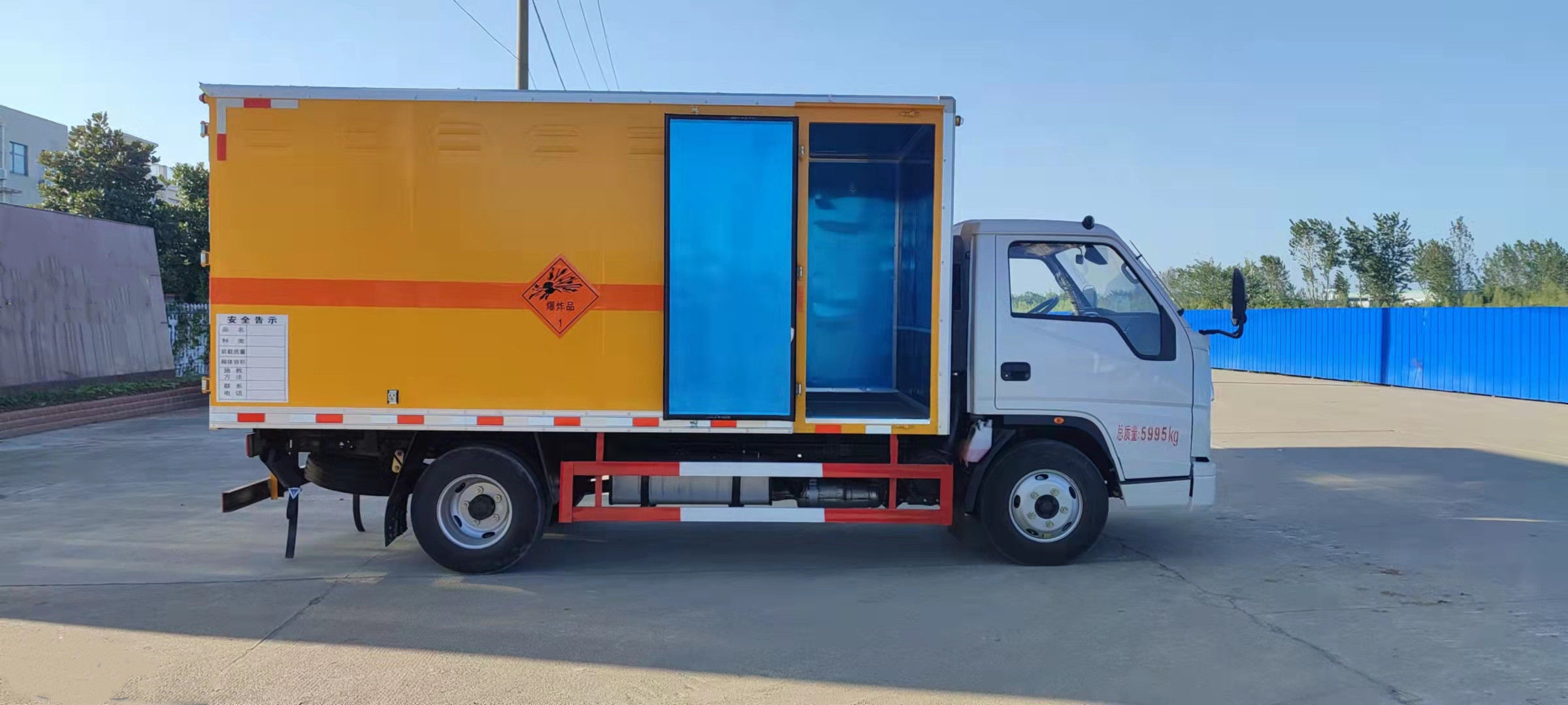 江鈴帶前開側門藍牌國六民爆車嚴格按照公告尺寸制作。外板采用優質冷軋鋼板帶百葉窗,內飾為導電性能良好的鋁平板有透氣孔,矩形骨架結構內部填充防潮阻燃擠朔板,復合加鉚合工藝。廂體四周鋁合金包邊及包角,車廂底板鋪設防靜電膠皮,廂體前臉50公分高鋪設防靜電膠皮。后部設置對開門,可選裝側門位置,廂體內部兩側安裝捆綁貨物的臥環。廂體內部安裝煙霧報警器及防盜報警感應器。車廂一周粘貼橙色放光帶,箱體粘貼 菱形告示牌,安全告示牌(不銹鋼材質),危險品牌,箱體安裝示廓燈(前白后紅),拖地靜電帶。江鈴帶前開側門藍牌國六民爆車廂體后門及側門采用一次成型密封膠條,底板及所有門合頁處均做防銹處理,箱體采用雙組份丙稀酸油漆制作,所有門桿及合面均為熱鍍鋅材質。