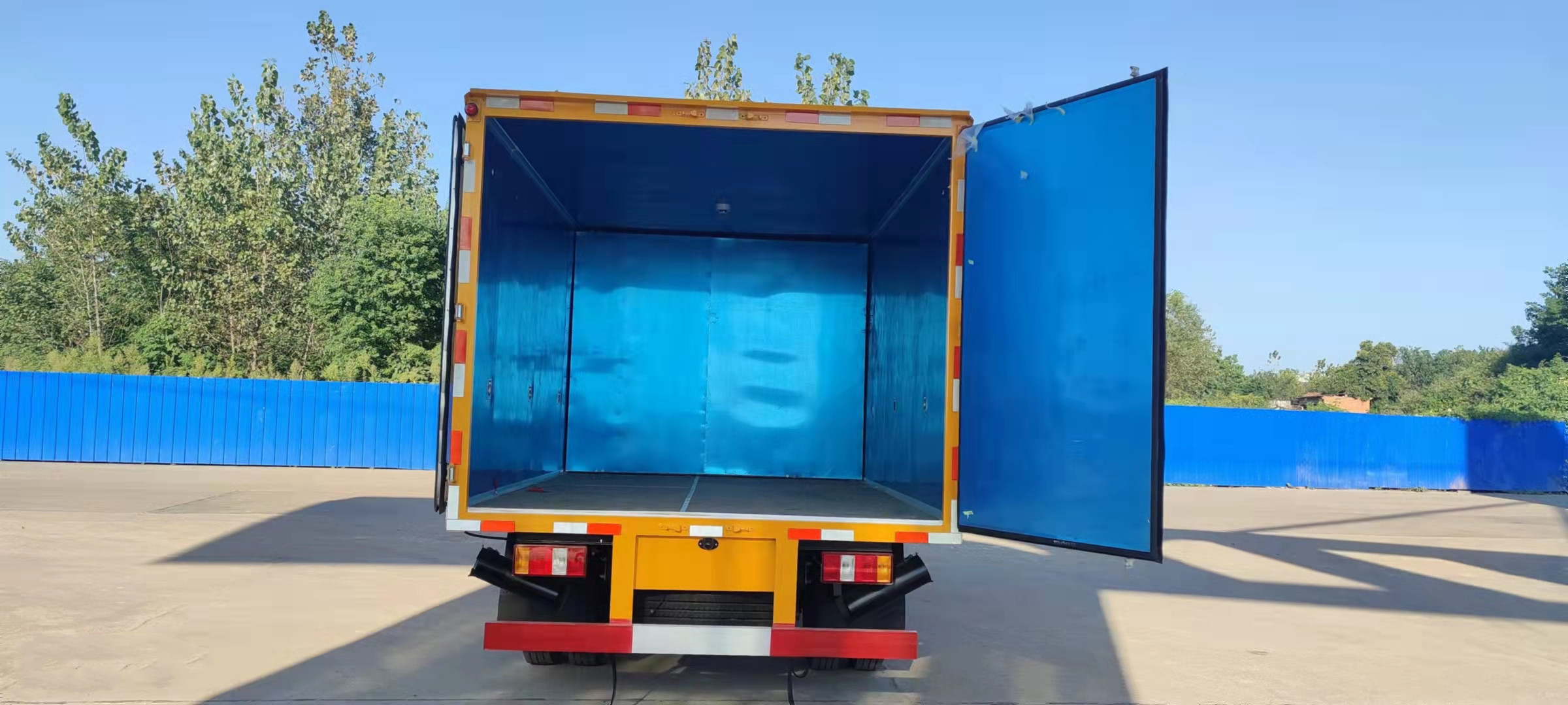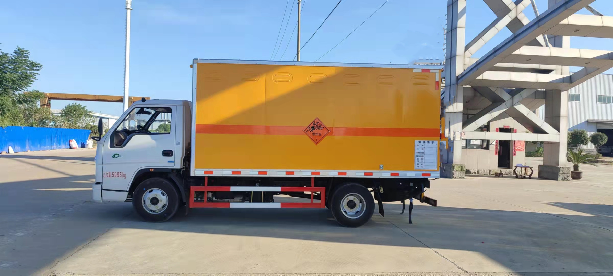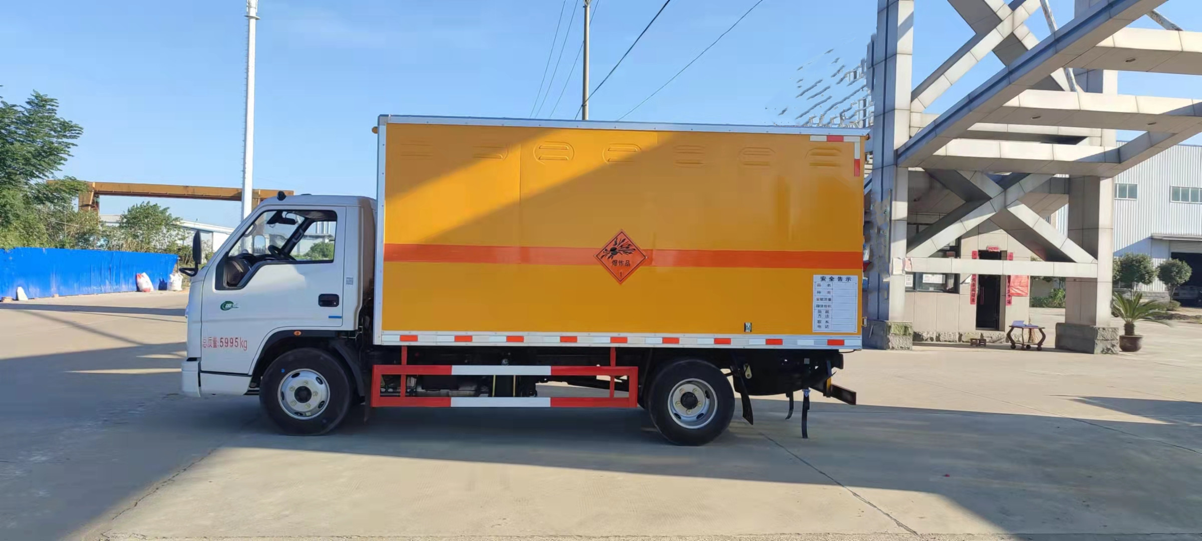 江鈴帶前開側門藍牌國六民爆車嚴格按照公告尺寸制作。外板采用優質冷軋鋼板帶百葉窗,內飾為導電性能良好的鋁平板有透氣孔,矩形骨架結構內部填充防潮阻燃擠朔板,復合加鉚合工藝。廂體四周鋁合金包邊及包角,車廂底板鋪設防靜電膠皮,廂體前臉50公分高鋪設防靜電膠皮。后部設置對開門,可選裝側門位置,廂體內部兩側安裝捆綁貨物的臥環。廂體內部安裝煙霧報警器及防盜報警感應器。車廂一周粘貼橙色放光帶,箱體粘貼 菱形告示牌,安全告示牌(不銹鋼材質),危險品牌,箱體安裝示廓燈(前白后紅),拖地靜電帶。江鈴帶前開側門藍牌國六民爆車廂體后門及側門采用一次成型密封膠條,底板及所有門合頁處均做防銹處理,箱體采用雙組份丙稀酸油漆制作,所有門桿及合面均為熱鍍鋅材質。