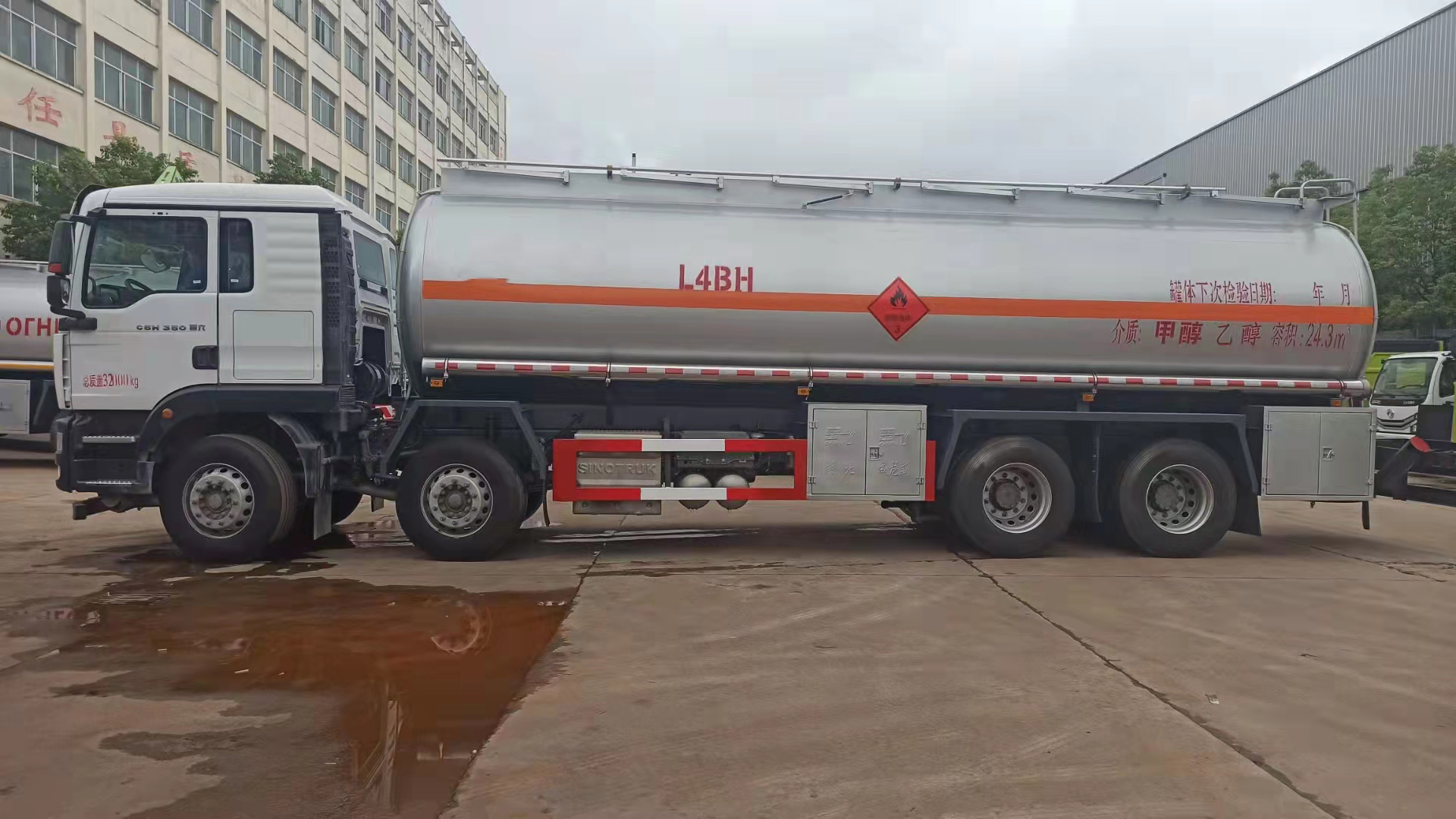 汕德卡國六前四后八甲醇運輸車采用的是平頂駕駛室,350馬力發動機,9檔變速箱,軸距1800+4575+1400mm,轉向輪爆胎應急裝置;選裝倒車蜂鳴器;選裝胎壓監測系統;選裝危險品標志燈。公告有效容積:24.3立方,罐體尺寸:8800×1980mm,正圓形罐體,國標厚度,分雙倉,帶甲醇化工泵,泵進泵出在尾部,兩個甲醇專用罐口、兩個海底閥,帶語音提示報警裝置,帶兩套安全閥及爆破片,帶真空閥,介質:甲醇,乙醇,丙酮,異丙醇。