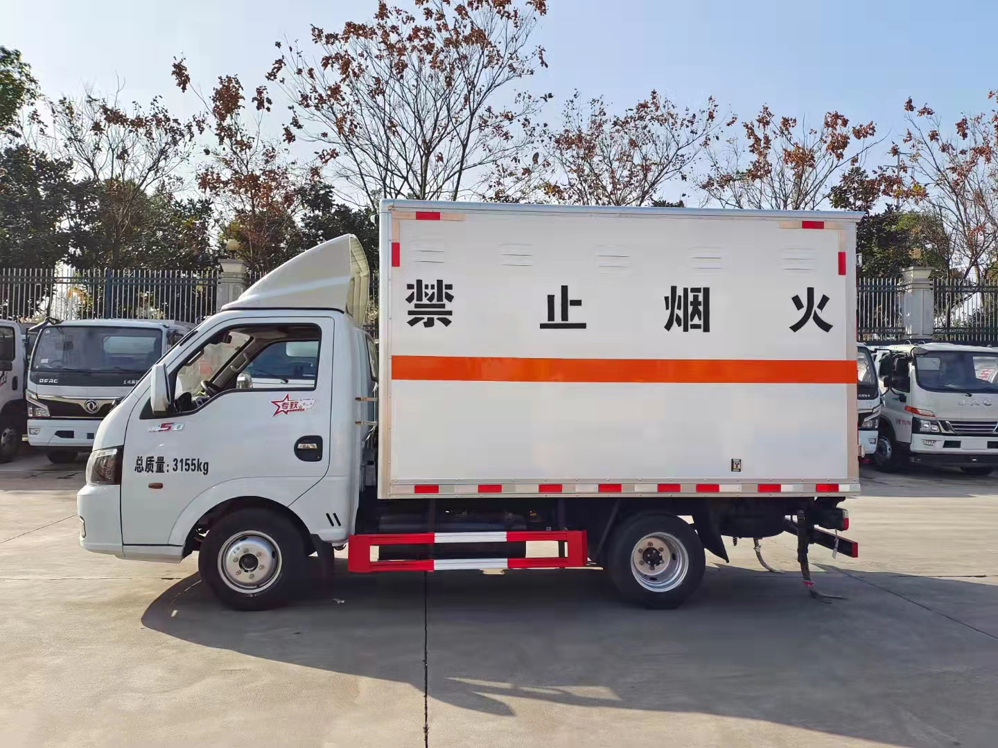 東風途逸國六汽油帶雙開側門危險品車外板采用1mm厚冷軋板有一次成型的百葉窗,內飾為導電性能良好的鋁板含透氣孔,內襯為矩形管骨架牢靠穩定,內部填充為透氣防潮阻燃的擠塑板,底板和車廂前下部鋪橡膠皮,廂體外部上下鋁合金型材包邊,后門雙開,右側帶單開雙開門,內部有固定貨物的臥環,外部有靜電帶,滅火器,防火罩,廂內安裝煙霧警報器。