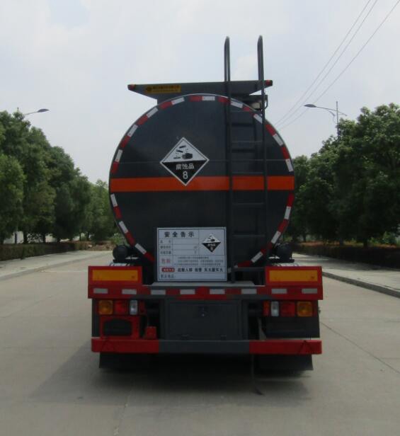 腐蝕性物品半掛運輸車采用的是3橋廣東富華盤式制動車軸,富華氣囊懸架,12條12R22.5 12PR成山牌真空胎(鐵鋼圈)。50牽引銷,28噸單動支腿,EBS,斷氣剎,制動襯片報警,一個備胎架不含備胎。外罐體材質為Q235B型4.2mm厚板材,封頭4.5mm厚,罐體通倉,內襯20mm聚乙烯,雙層鋼襯塑防浪板,兩個全塑罐口蓋,兩套不銹鋼安全閥,帶全塑接酸盤并用軟管引下,罐口周圍用方盒子式圍邊,圍板內做重瀝青防腐,罐體頂部帶不銹鋼升降護欄,花紋板走道,罐體尾底部帶一個DN100不銹鋼襯氟海底閥(海底閥帶聲光報警裝置),罐體后尾部左右各一個DN80襯氟球閥為出料口帶全塑保護箱,大梁下出料,一個工具箱,尾部爬梯。兩根卸料管,兩個8KG滅火器,其余標配。